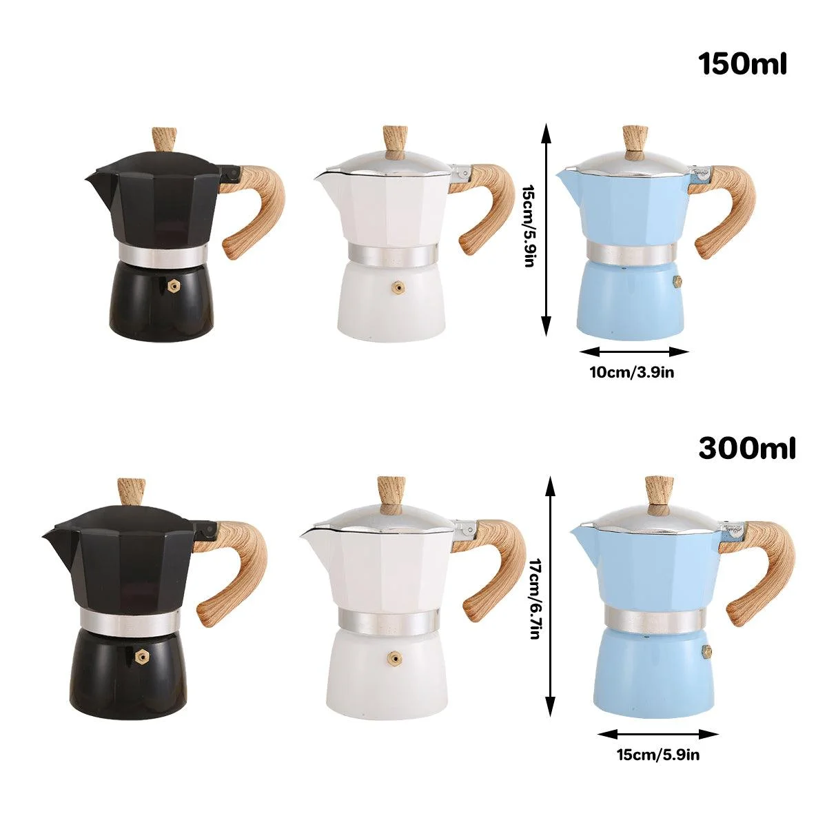 Enjoy a rich and authentic coffee experience with this portable stovetop coffee maker. Designed with a classic Italian Moka pot style, it features a durable aluminum body and a stylish wood grain handle for a comfortable grip. Whether at home, in the office, or on a camping trip, this compact coffee maker allows you to brew fresh espresso easily. It is suitable for gas, ceramic, and alcohol stoves, making it a versatile choice for coffee lovers.