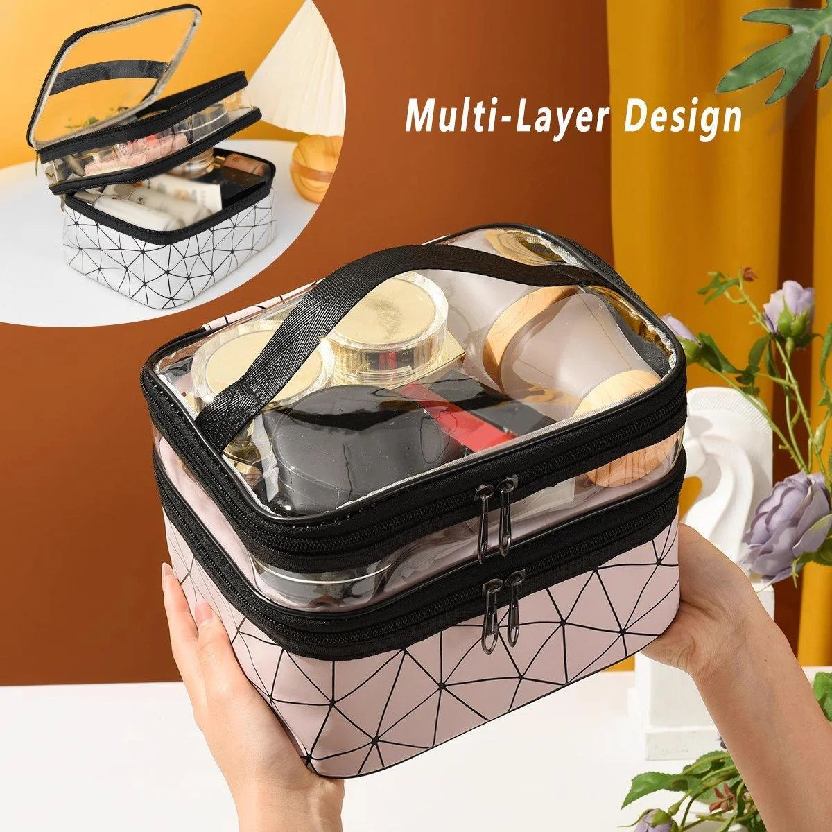 Double-Layer Design: Separate compartments for easy organisation of cosmetics and toiletries, keeping items accessible and secure.