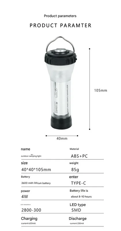 Enjoy enhanced outdoor illumination with our Portable Outdoor Camping Lantern. Designed for exploration, camping, and hiking, this versatile light offers various lighting needs. It features a removable soft light diffuser for ambient lighting, a forward-facing flashlight option for directional beam, and side-emitting lighting for broader area coverage. The set includes a mini tripod stand for stable placement. Designed for convenience, the light is rechargeable via USB-C for fast charging and long runtime (approx. 8-10 hours). Made from durable ABS+PC materials, this lightweight lantern (approx. 85g) is ideal for a range of outdoor and emergency situations. The light output is around 100 lumens, emitted at a comfortable 2800-3000K. Easy to assemble with multiple accessories for customized light. The anti-slip rubber boot enhances stability.