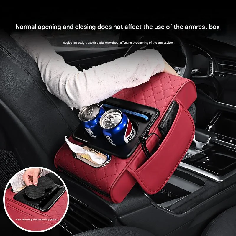 This innovative armrest box features a clever, multi-partitioned design to keep your essentials neatly organized and within reach. It includes a dedicated compartment for water bottles or cans, a convenient slot for your mobile phone, and a built-in tissue dispenser for quick access. An additional side storage pocket provides extra space for small items, ensuring a clutter-free car interior.