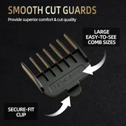 4 Comb lengths 3-8mm. Also includes Scissors and comb, protective blade cover, maintenance oil and cleaning brush.