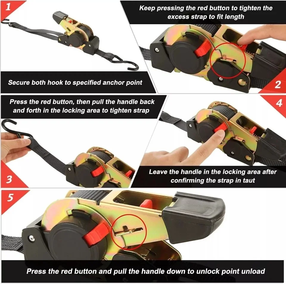 Auto Retractable Ratchet Straps:Auto ratchet straps self retractable features an automatic retraction mechanism, simply press the red button, and this retractable ratchet strap retracts safely and quickly, you don't need to retract it manually, lets you enjoy quick retraction of the strap.