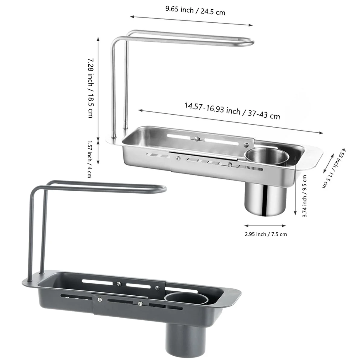 This sink drain rack is designed for multifunctional kitchen storage and drainage. It features a retractable basket design, allowing it to adapt to various sink sizes. With double-layer structure, it supports tidy storage of cleaning tools, sponges, and cloths. The integrated drainage cup efficiently filters kitchen waste and water, while the upper bar provides a hygienic solution for drying cloths.