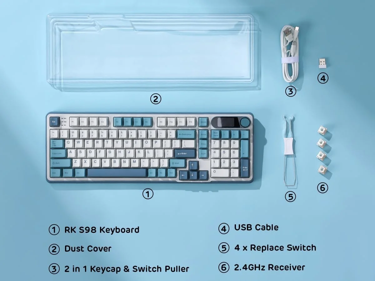 Compact Screen, Infinite Possibilities - RK S98 keyboard redefines versatility. A dynamic display showcases custom GIFs, dates, connection modes, WIN/MAC layouts, and battery status on its small screen.