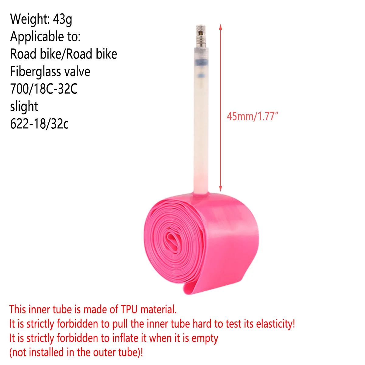 Elevate your cycling with these road and mountain bike inner tubes.Crafted from ultra - light TPU, they offer durability, flexibility, and puncture resistance for long rides.The 45mm French valve ensures easy inflation, and the vibrant pink hue adds style while enhancing visibility.Lightweight and compact, they’re ideal as spares for 700C wheels (18C - 32C), suiting road and mountain bikes.