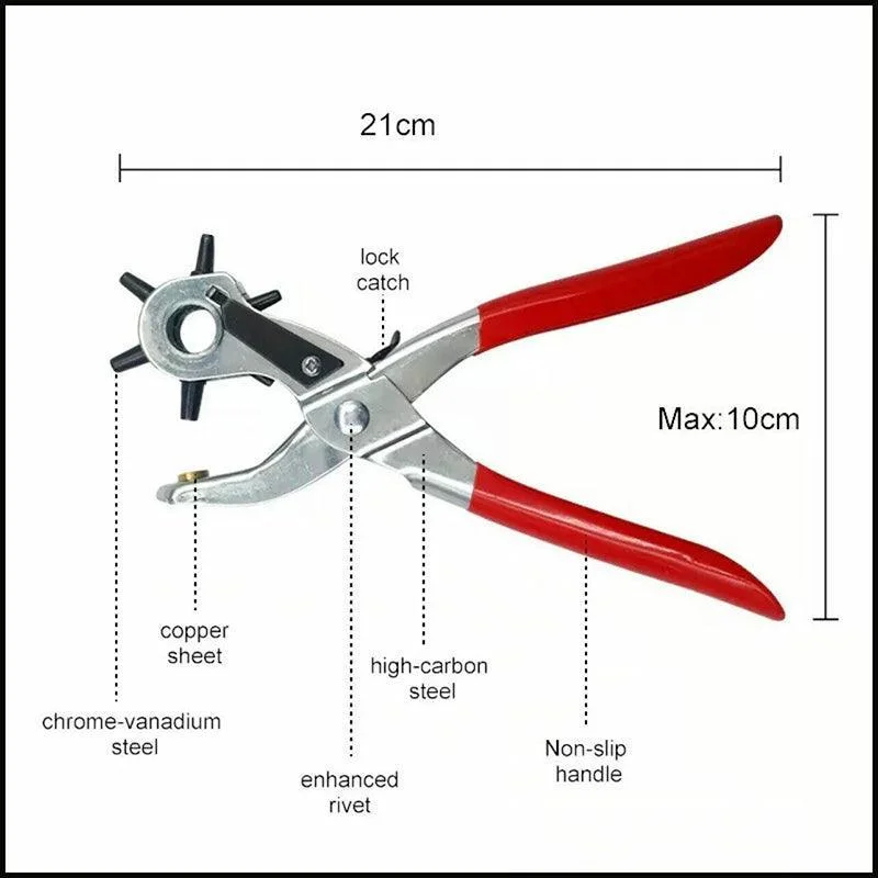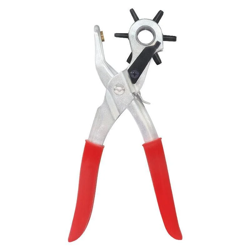 This revolving leather hole punch plier is designed for effortless and precise punching on leather, plastic, paper, and more. Featuring 6 rotating punch heads (2mm, 2.5mm, 3mm, 3.5mm, 4mm, 4.5mm), it allows easy switching between sizes to meet different crafting and repair needs. Built with a chrome-vanadium steel body, reinforced high-carbon steel core, and non-slip dipped handle, this tool offers durability, comfort, and long service life. The heat-treated punch tips ensure clean cuts through a range of materials.
