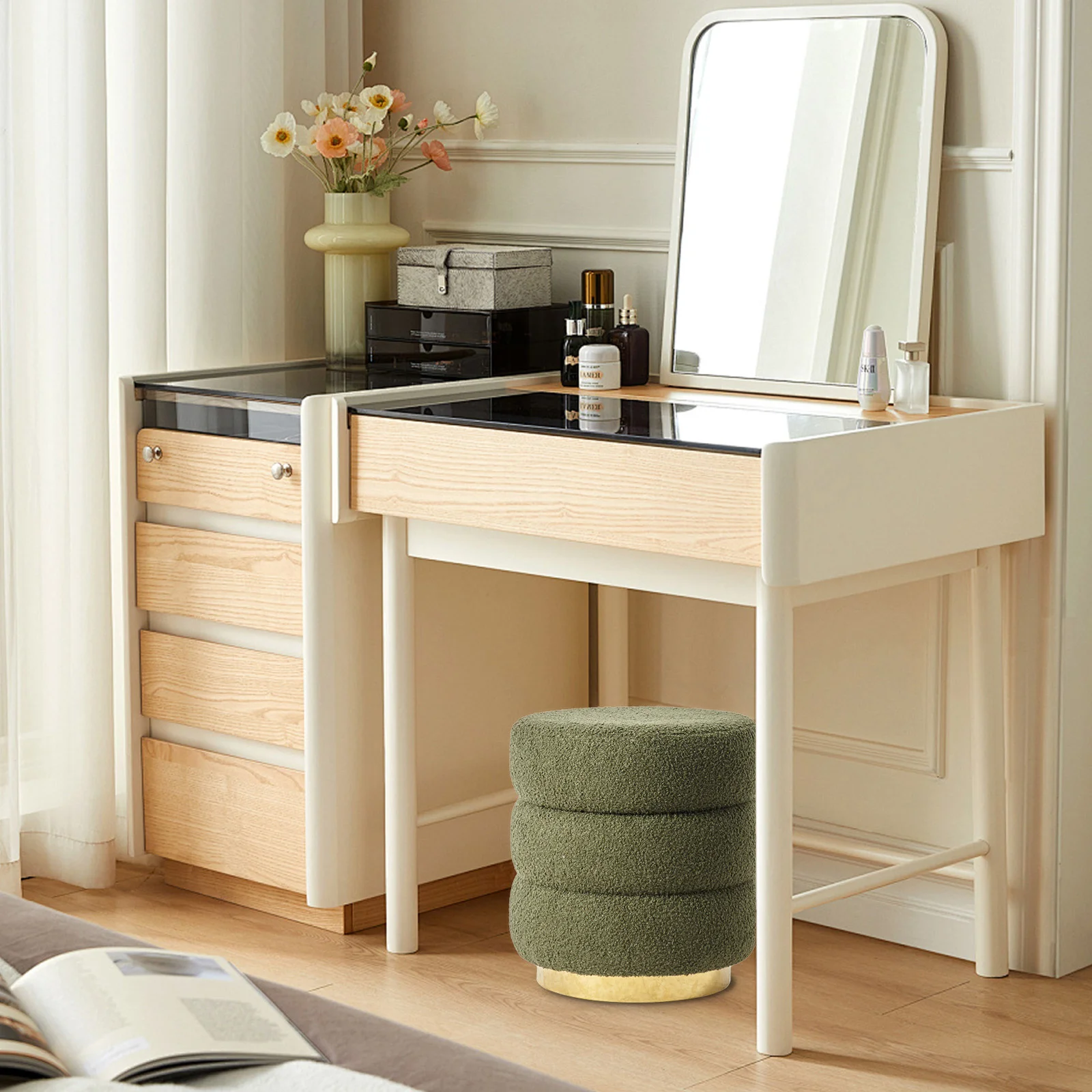 La Bella Round Stacked Ottoman Stool Teddy Fleece Fabric Foot Rest 38cm - Green