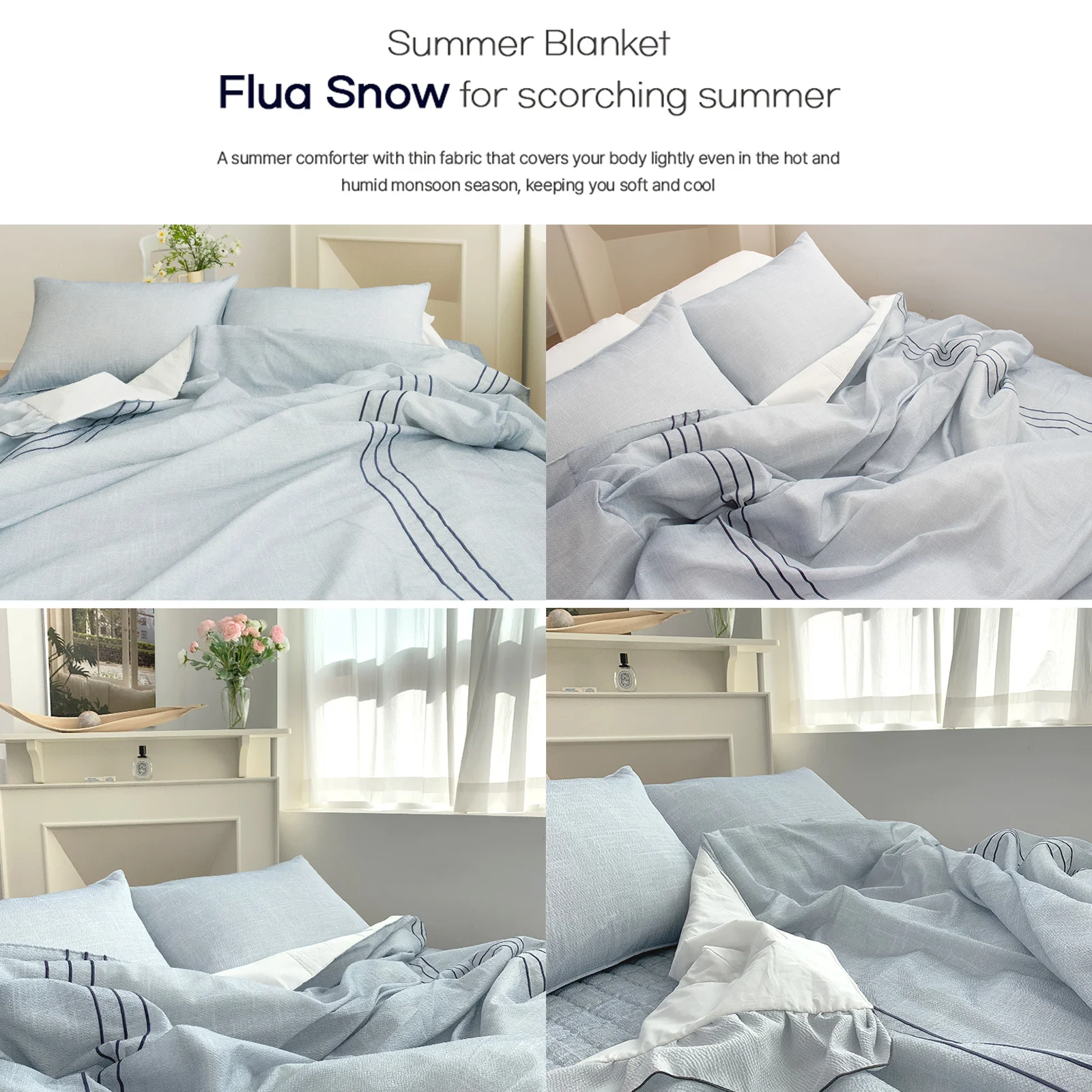 SAESOM proudly presents the Flua Snow Comforter, a comprehensive set featuring a comforter, pad, and 2 pillowcases. Our creations are meticulously crafted in Korea for a cool, skin-friendly, and breathable sleep experience, ideal for summer nights. Here's why it stands out: