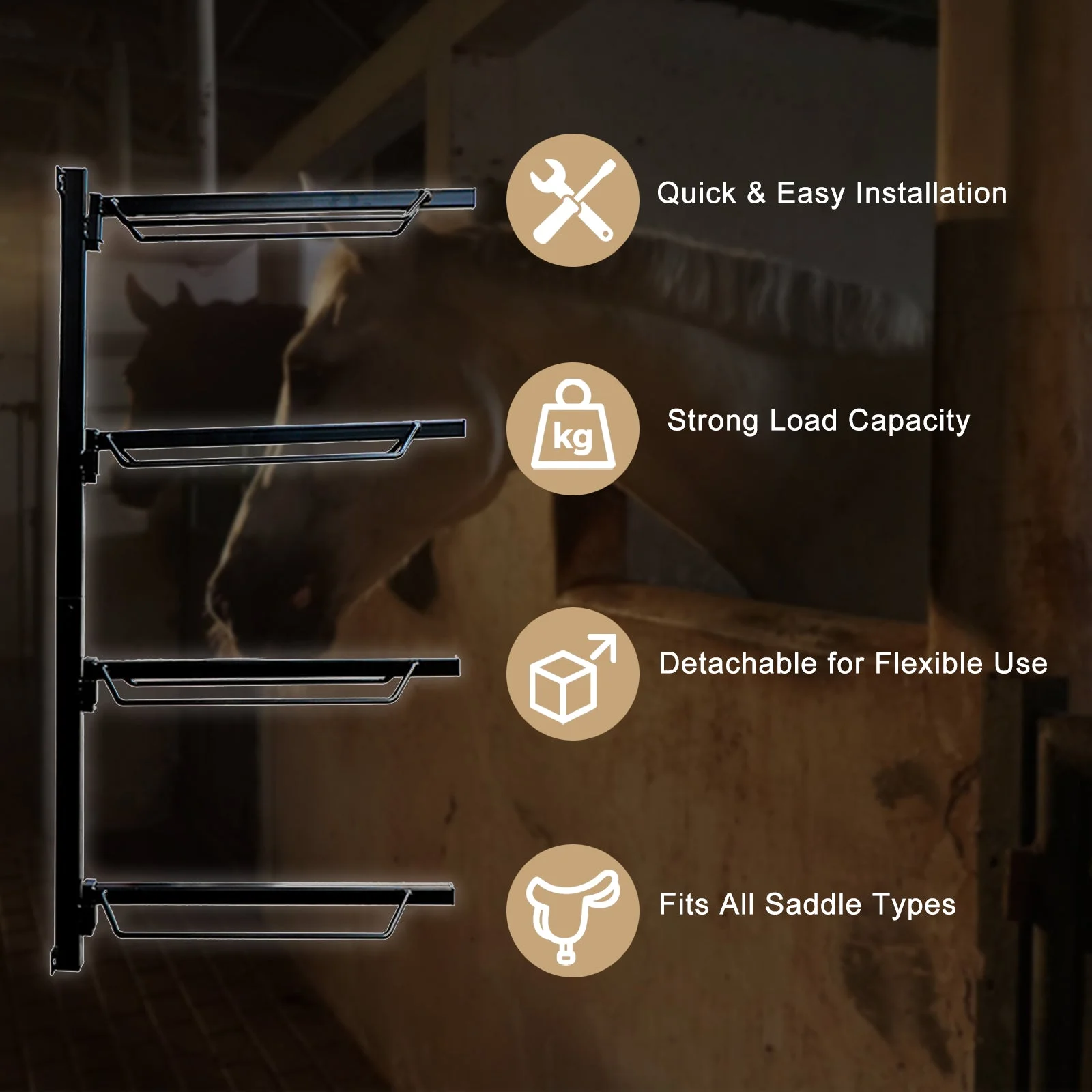 Wall-mounted vertical layout maximizes storage in tack rooms or barns, keeping saddles off the floor and saving valuable space.