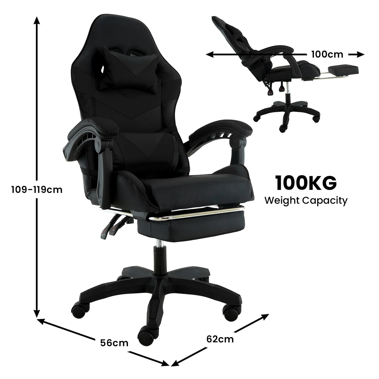 - Dimensions with Footrest Extended: 62 x 100 x 109-119cm