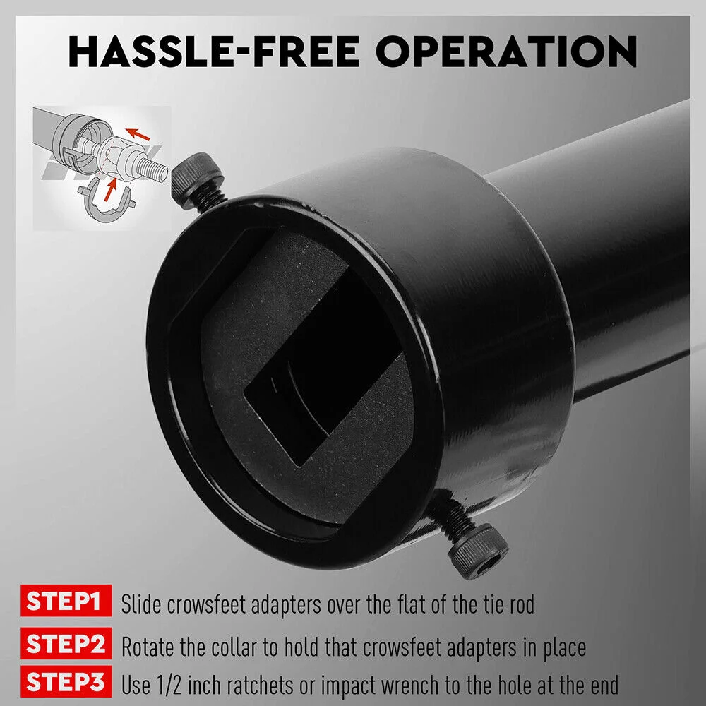 All-steel Forged:Our tie rod drawing tools and adapters are made of durable, all-steel forging that ensures long-lasting use. The flexible sliding collar on the sleeve's top securely holds the crowd feet adapters in place, while its compatibility with 1/2" drive wrenches allows you to install parts that ordinary wrenches cannot handle. Additionally, the knurled handle provides a firm grip for optimal control at all times.