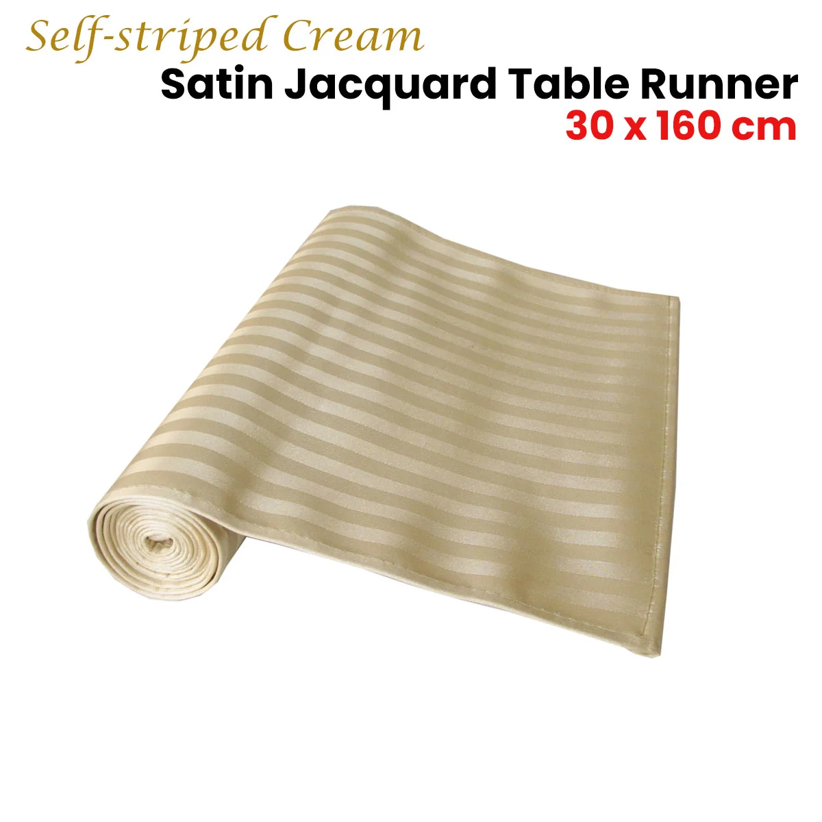Make your table decoration visually appealing on special occasions with this Self-striped Cream Satin Jacquard Table Runner 30 x 160cm. Table runners are a great way to accent your dining table for any occasions. This table runner features a classy striped design in soft colour tone that adds elegance to any tabletop. It is made from durable and wrinkle resistant Polyester fabric.