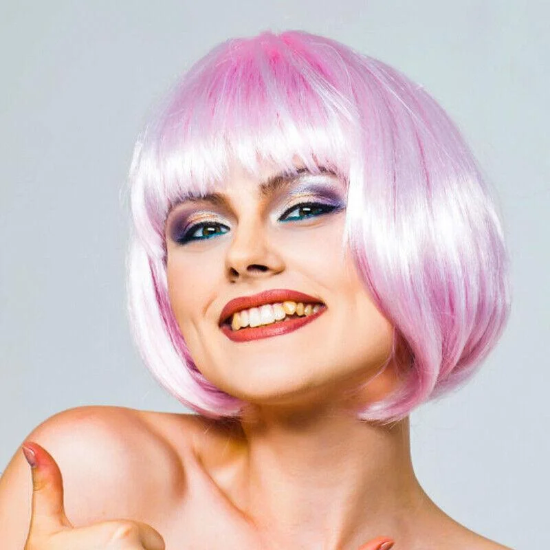Transform your look instantly with this short bob wig with bangs, available in 14 vibrant colours. Made from high-quality synthetic fibre (K/P silk), it offers a sleek, playful finish perfect for cosplay, stage performances, parties, Halloween, or themed events. This lightweight cosplay wig is easy to wear, designed to fit a wide range of users, and features a stylish bobo cut that frames the face with a youthful touch.