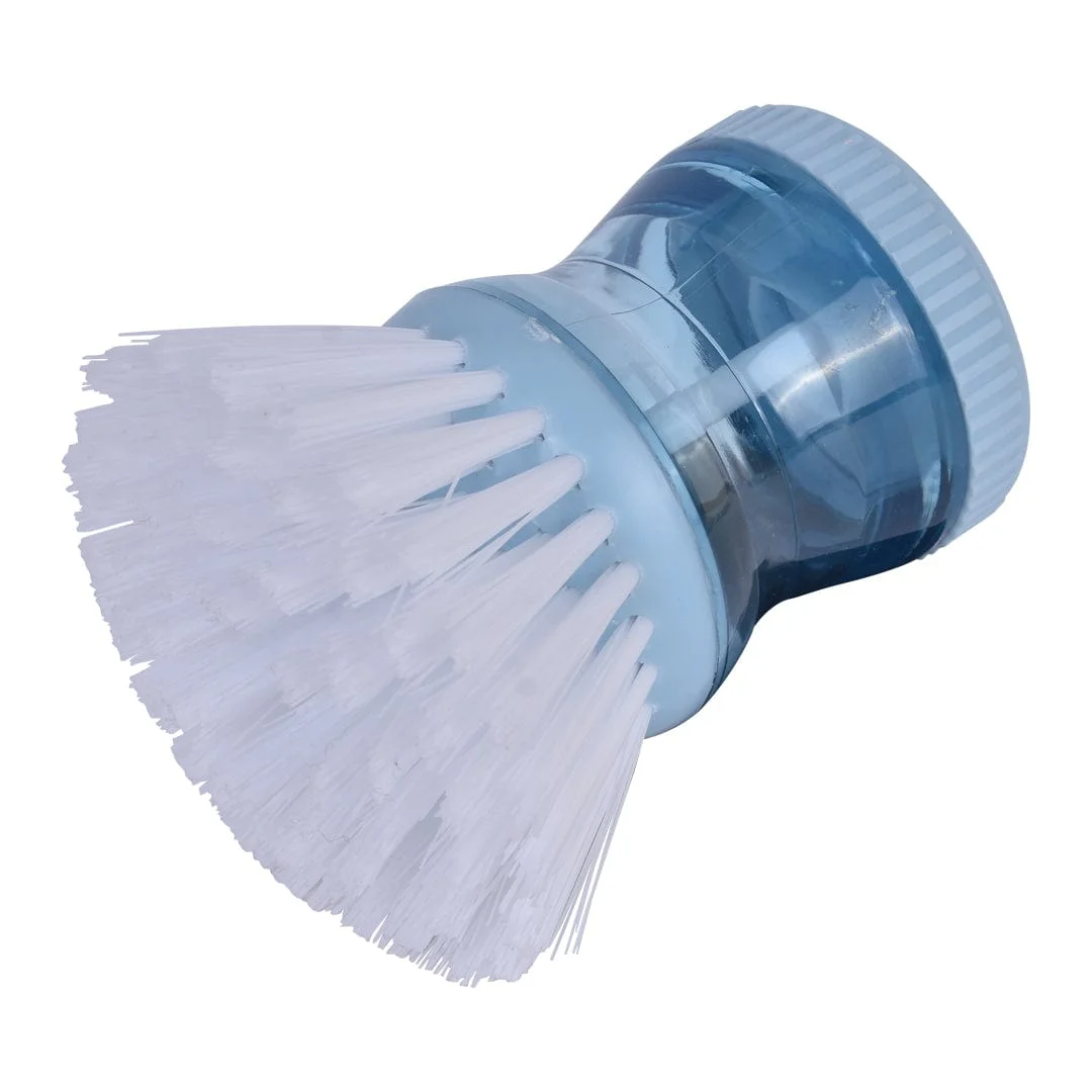 Turn the cap anti-clockwise to open, fill the body of this dishwashing brush with soap and lock it clockwise. It will squirt soap with a light push of the button on top. You can fill this dish scrub brush with your favourite dish soap.