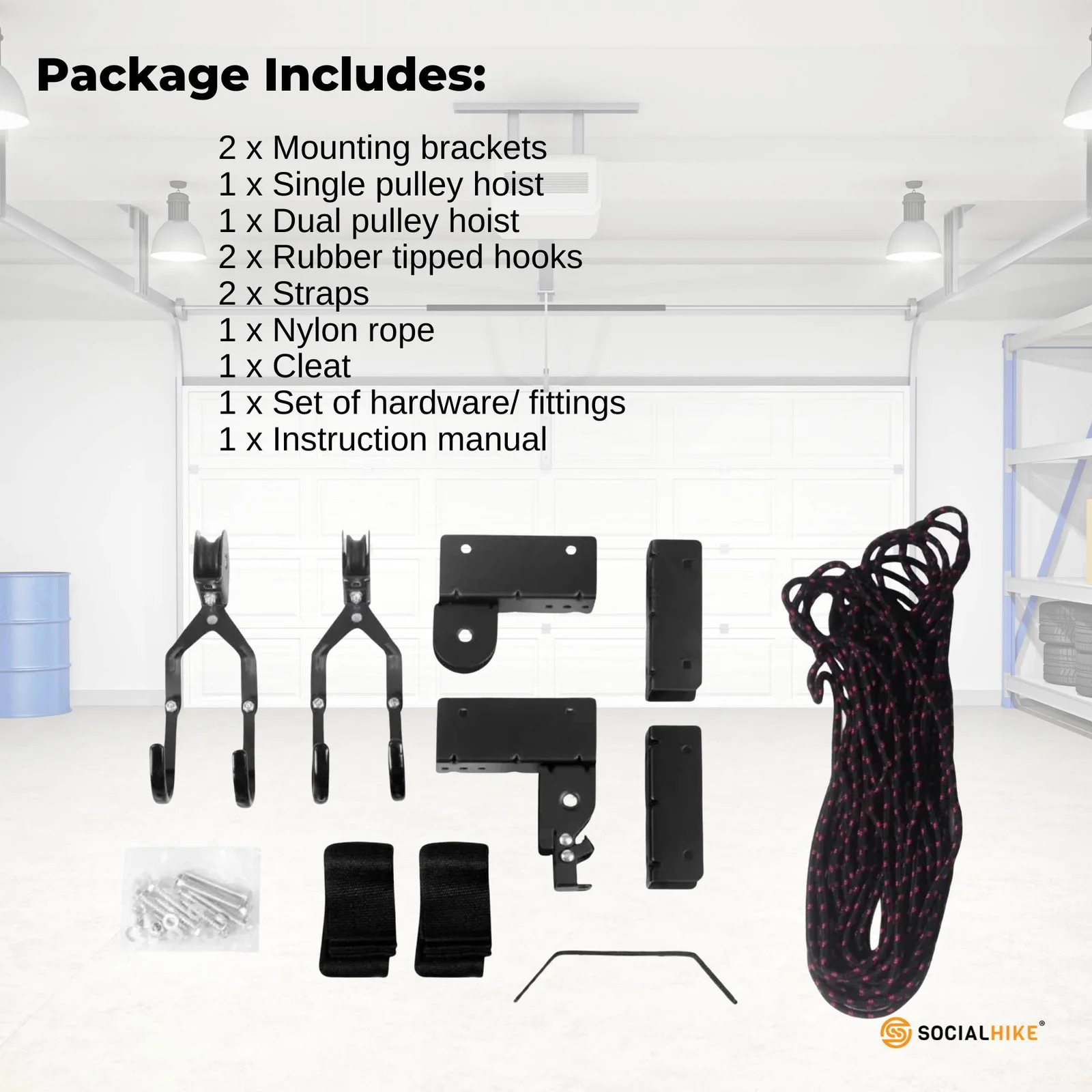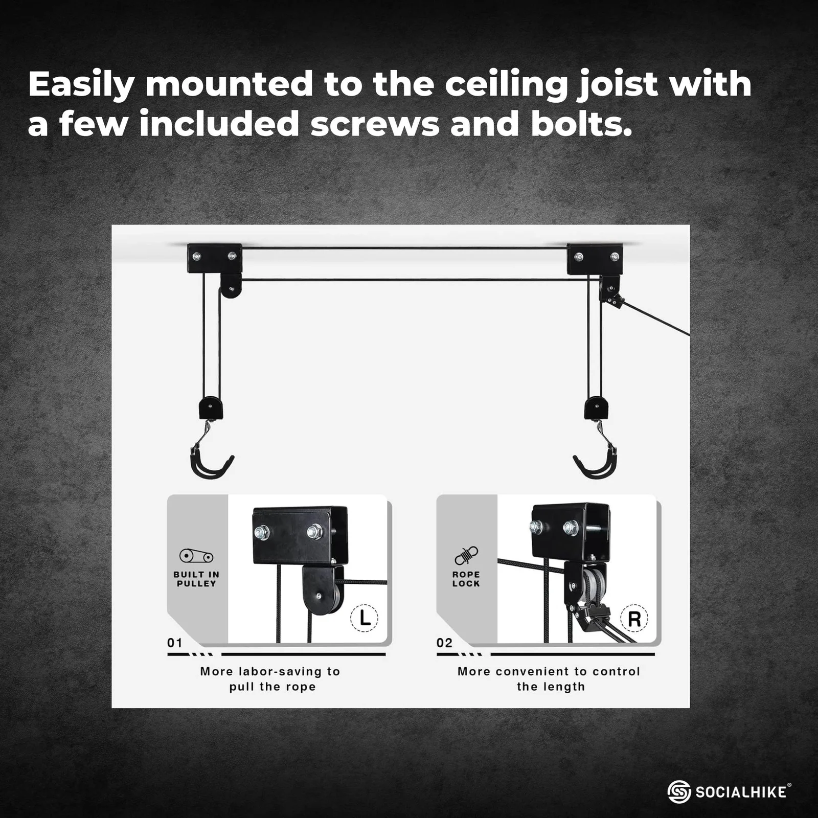 With a 45kg/ 100lb load capacity you can be sure that even the larger versions of kayaks can be stored with this hoist system. Easily mounted to the ceiling joist with a few included screws and bolts.