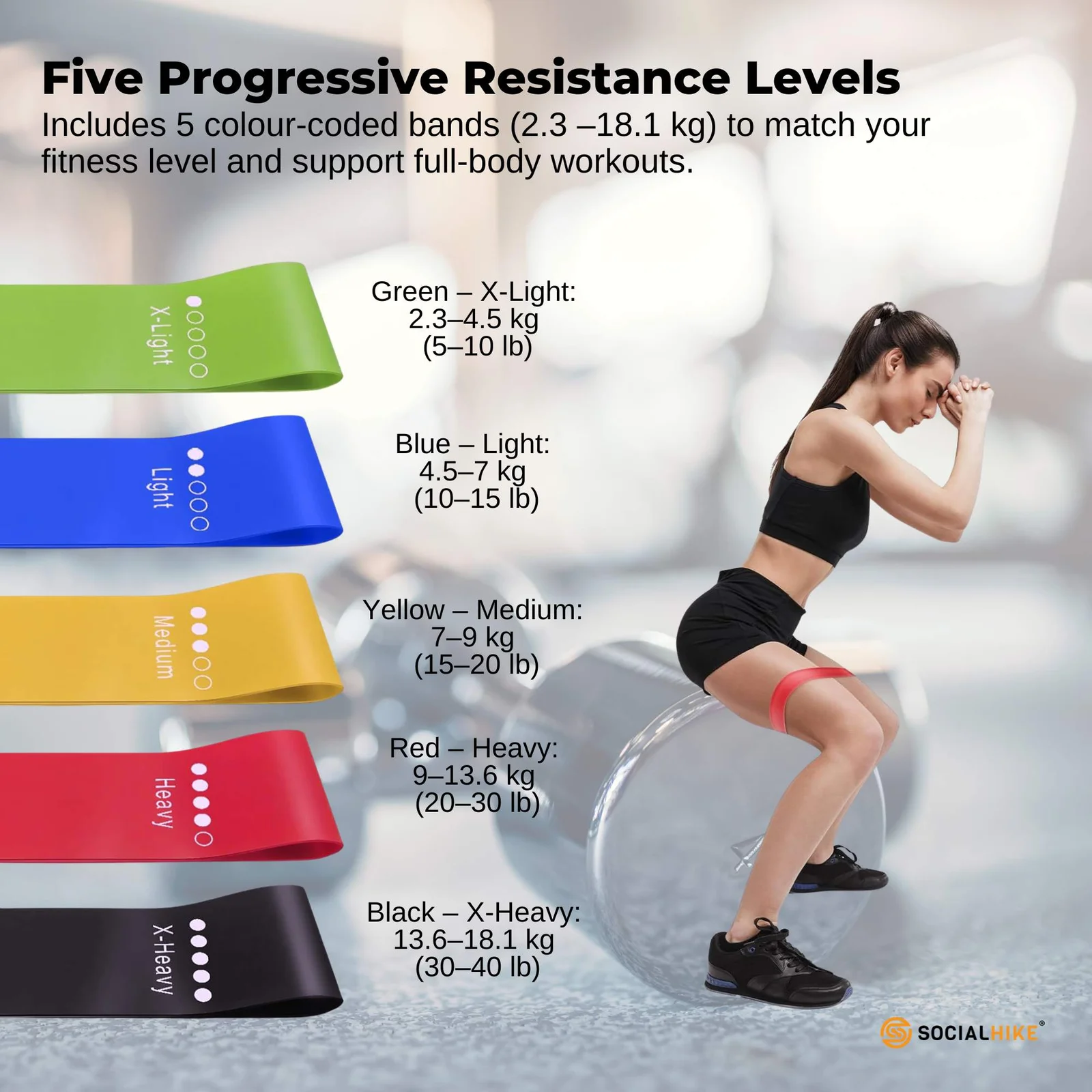 - Five Progressive Resistance Levels: Includes 5 colour-coded bands (2.3 –18.1 kg) to match your fitness level and support full-body workouts.