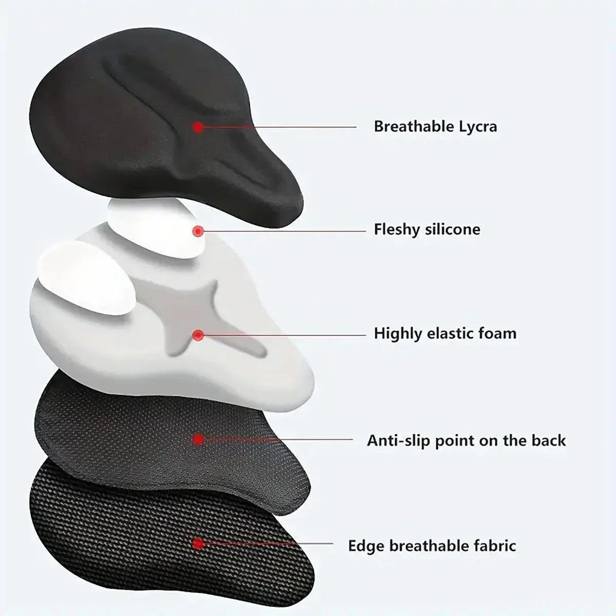 Enjoy a more comfortable and enjoyable ride with this soft silicone bicycle seat cover. Designed for long-distance cycling, this cover features thickened silicone padding to relieve pressure on sensitive areas, making it ideal for rough mountain trails or everyday city commutes. The breathable design ensures maximum airflow, keeping you cool even on the hottest days. With its secure non-slip surface, the cover stays firmly in place, giving you stability throughout your ride. Crafted from durable silicone and Lycra, this seat cover is made to last, ensuring long-term use without wear and tear. It fits most standard bike saddles and is easy to install without tools.