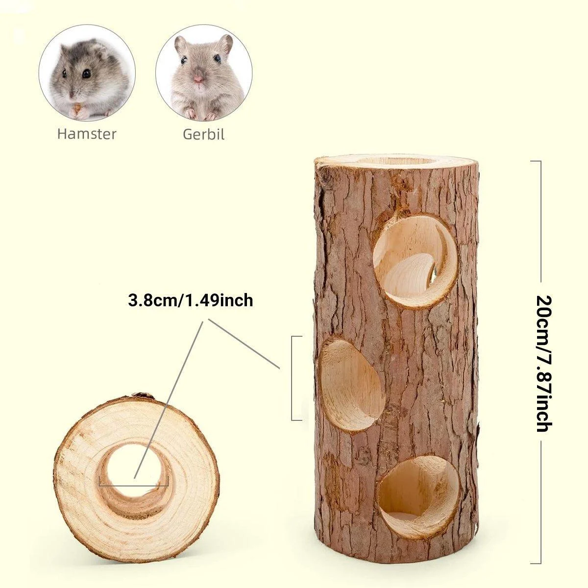 Enhance your small pet's habitat with this premium solid wood hamster tunnel. Crafted from natural wood, this durable and chew-safe tunnel provides a fun and safe environment for your hamster, gerbil, or other small pets. The natural bark finish offers a rustic and appealing look, while the multiple holes and openings encourage exploration and play. Perfect for adding enrichment to your pet's cage, this tunnel also serves as a great exercise and chewing toy, promoting healthy teeth and gums.