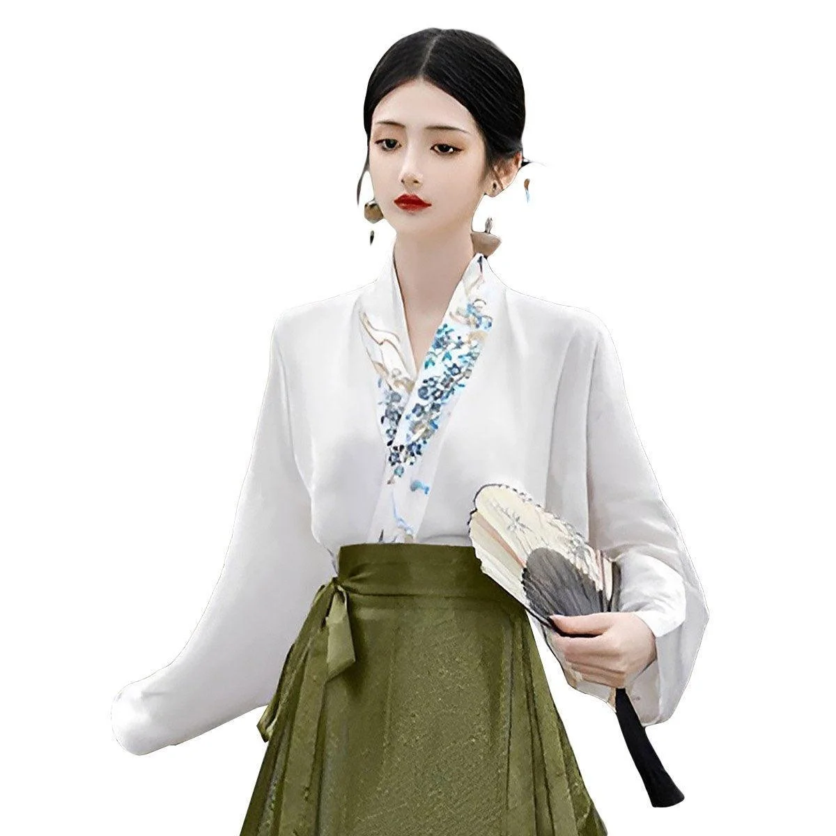 Step into timeless elegance with this New aircraft sleeve horse skirt set for women. Designed for spring and autumn, this improved daily Hanfu is perfect for commuting and casual wear. The set includes a beautifully embroidered white top with a one-word collar and a flowing bean green skirt adorned with delicate bird and floral patterns. Made from premium materials, this Hanfu combines traditional aesthetics with modern comfort.