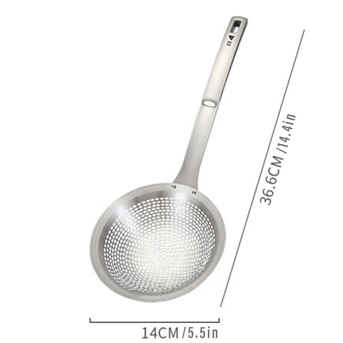 This 304 stainless steel colander is a must-have kitchen tool for efficient cooking, frying, and filtering. With a 5.5-inch (14 cm) diameter and a long 14.4-inch (36.6 cm) anti-scald handle, it ensures safe handling even during high-temperature tasks. The thickened mesh provides effective filtration for hot pot, noodles, dumplings, and deep-fried foods, ensuring no residue remains. Designed for durability and ease of use, this colander is polished for a sleek appearance and reinforced with rivets for long-lasting strength. It is also equipped with a convenient hanging hole for easy storage.