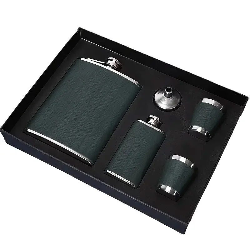 Enjoy your favourite spirits on the go with this compact and stylish flask set.Made from durable 304 stainless steel and wrapped in a dark green leather-look finish, it includes an 8oz flask, a mini flask, two shot cups, and a funnel.Its curved design ensures a secure grip and easy storage in pockets or bags, making it ideal for outdoor activities, festivals, or travel.