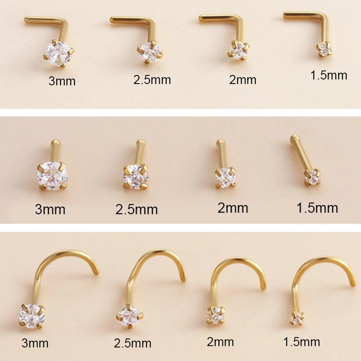 Add a touch of elegance to your look with this premium stainless steel nosepiece adorned with a lustrous gold-plated stud. Crafted for comfort and durability, this nosepiece is available in various rod styles, including straight, S-shaped, and L-shaped, to cater to different preferences and fit requirements. The sparkling cubic zirconia stones come in multiple sizes, ensuring a perfect choice for any occasion. Ideal for daily wear or special events, this nosepiece is a versatile addition to your jewellery collection.