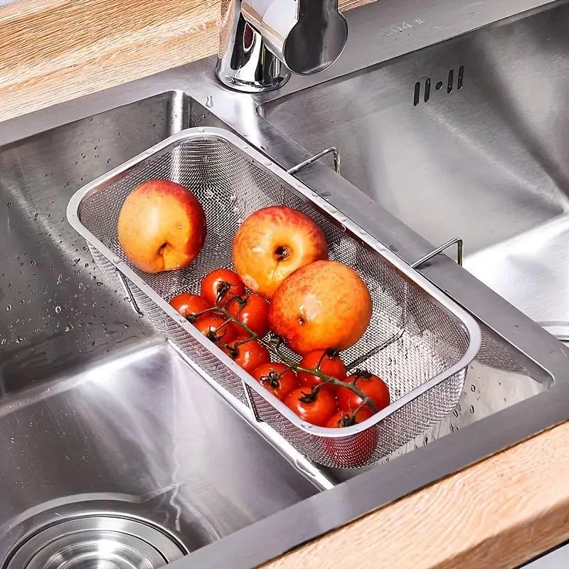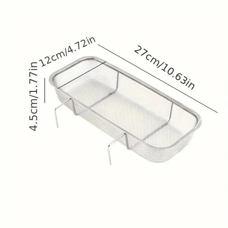 This stainless steel sink draining basket is a versatile kitchen tool designed to make food washing and draining easier. Made from durable stainless steel, it efficiently drains water from fruits, vegetables, and kitchen waste. The practical hanging design allows it to be mounted on the sink, placed on the countertop, or hung on the wall, providing flexible storage solutions. The fine mesh ensures quick drainage, while the high-quality material resists moisture and wear. For proper use, please ensure that the thickness of your sink is less than 3.5 cm to allow secure hanging.