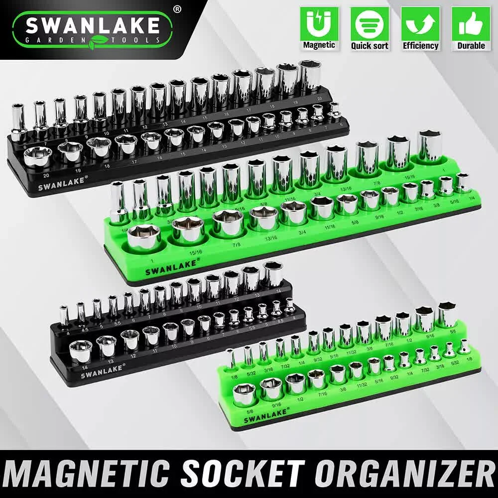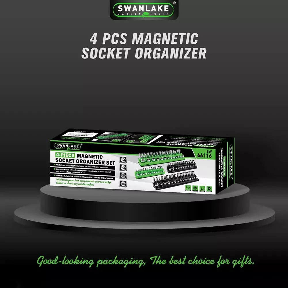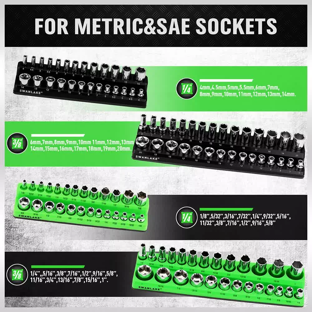 Includes 2pcs black metric magnetic socket organizers and 2pcs green SAE magnetic socket organizers for 1/4", 3/8" drives.