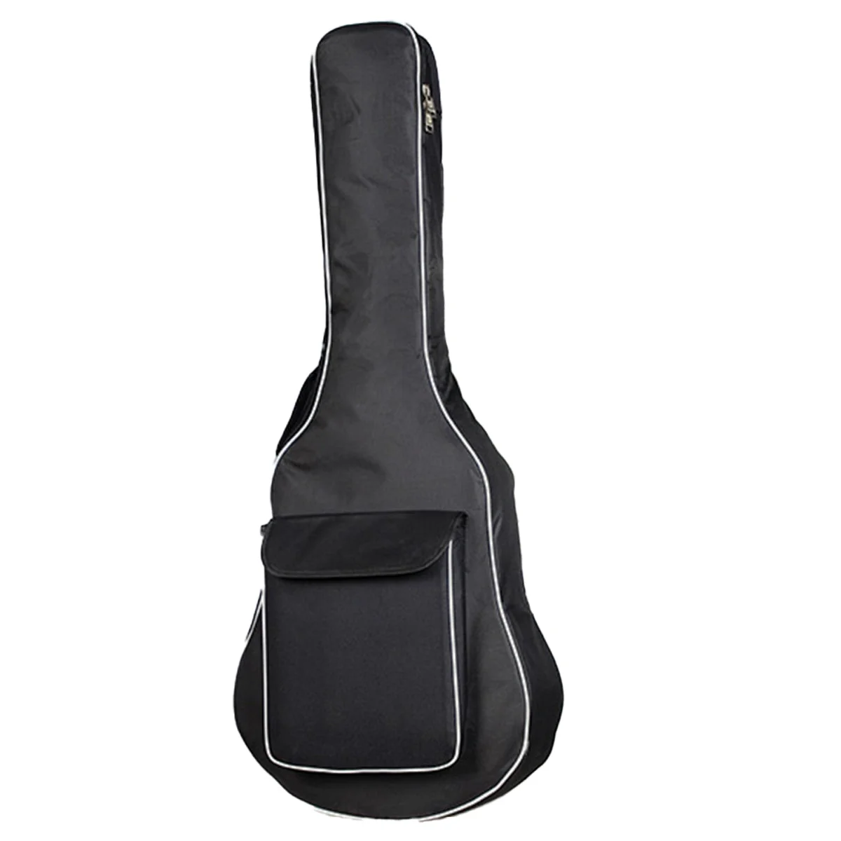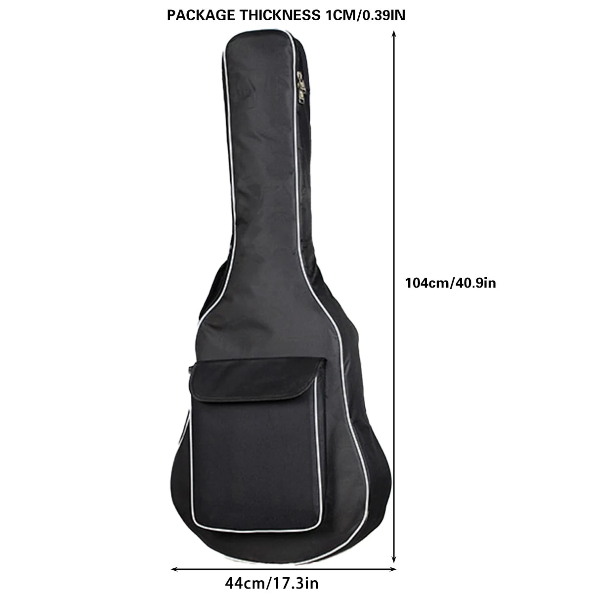 This thickened guitar bag offers reliable protection for your instrument, suitable for 41-inch acoustic, folk, or classical guitars.Made from durable Oxford cloth with thickened cotton padding, it shields against bumps and abrasions.With dual shoulder straps and a padded handle, it’s easy to carry, while a front pocket stores accessories like tuners and picks, ideal for commuting, traveling, or storage.