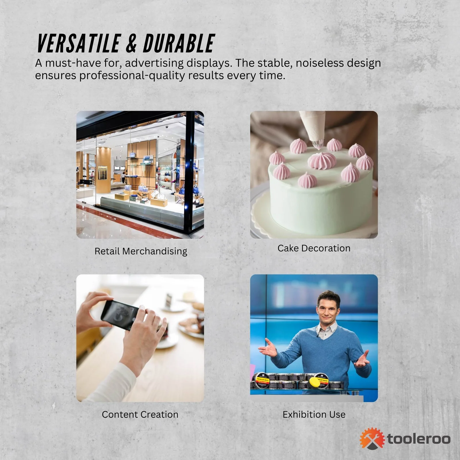 - Versatile Durable – A must-have for retail merchandising, advertising displays, cake decoration, and content creation. The stable, noiseless design ensures professional-quality results every time.