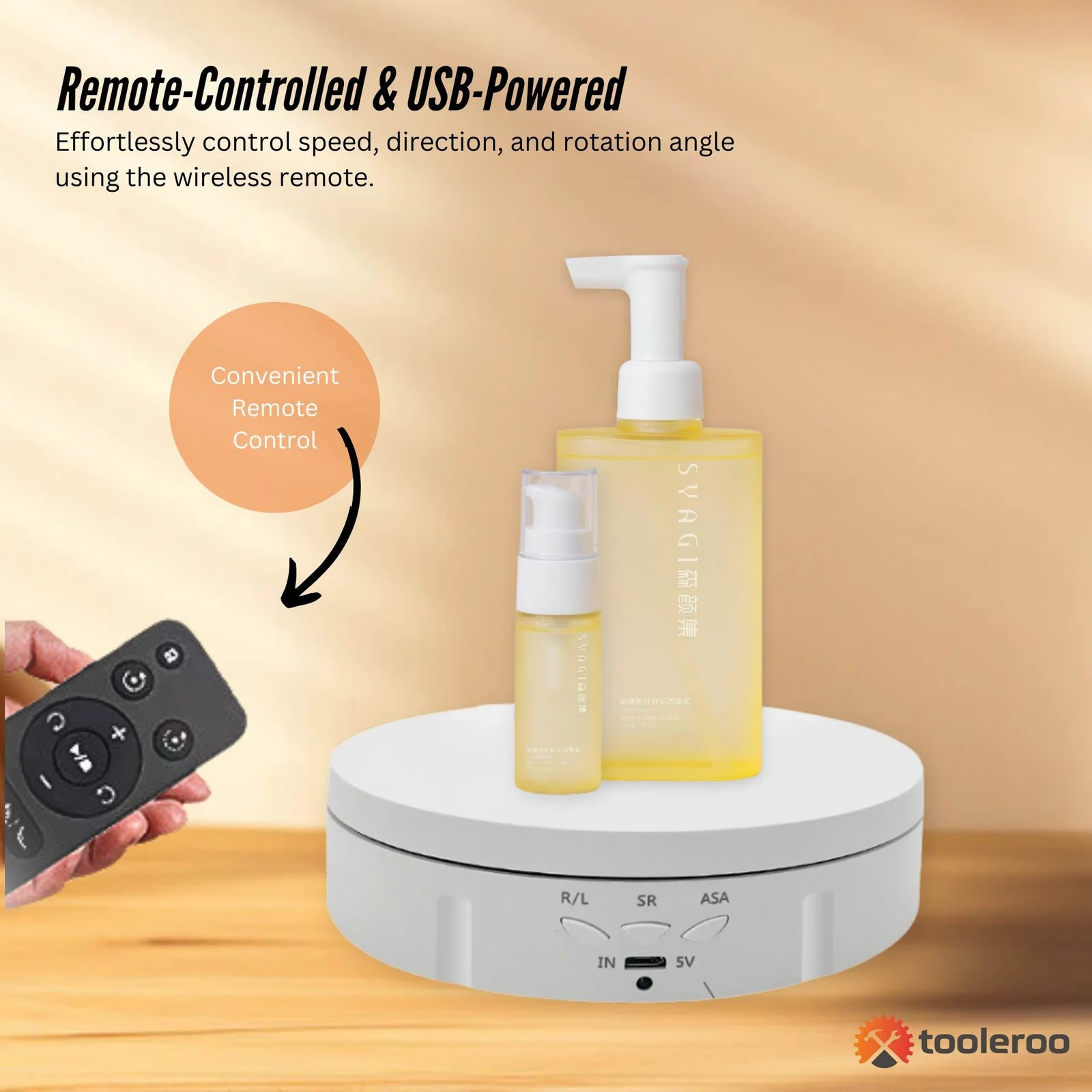 Tooleroo 3-in-1 Electric Rotating Display Stand – Elevate your product presentations with this 360° motorised turntable, designed for photography, videography, and retail displays. Featuring adjustable speeds, three interchangeable platform sizes, and multiple rotation angles, this quiet, USB-powered display stand comes with the option of using a rechargeable battery, and is perfect for showcasing jewellery, electronics, cakes, and more. Remote-controlled for effortless operation, it supports up to 10kg and ensures smooth, stable rotation—ideal for professional merchandising and content creation.