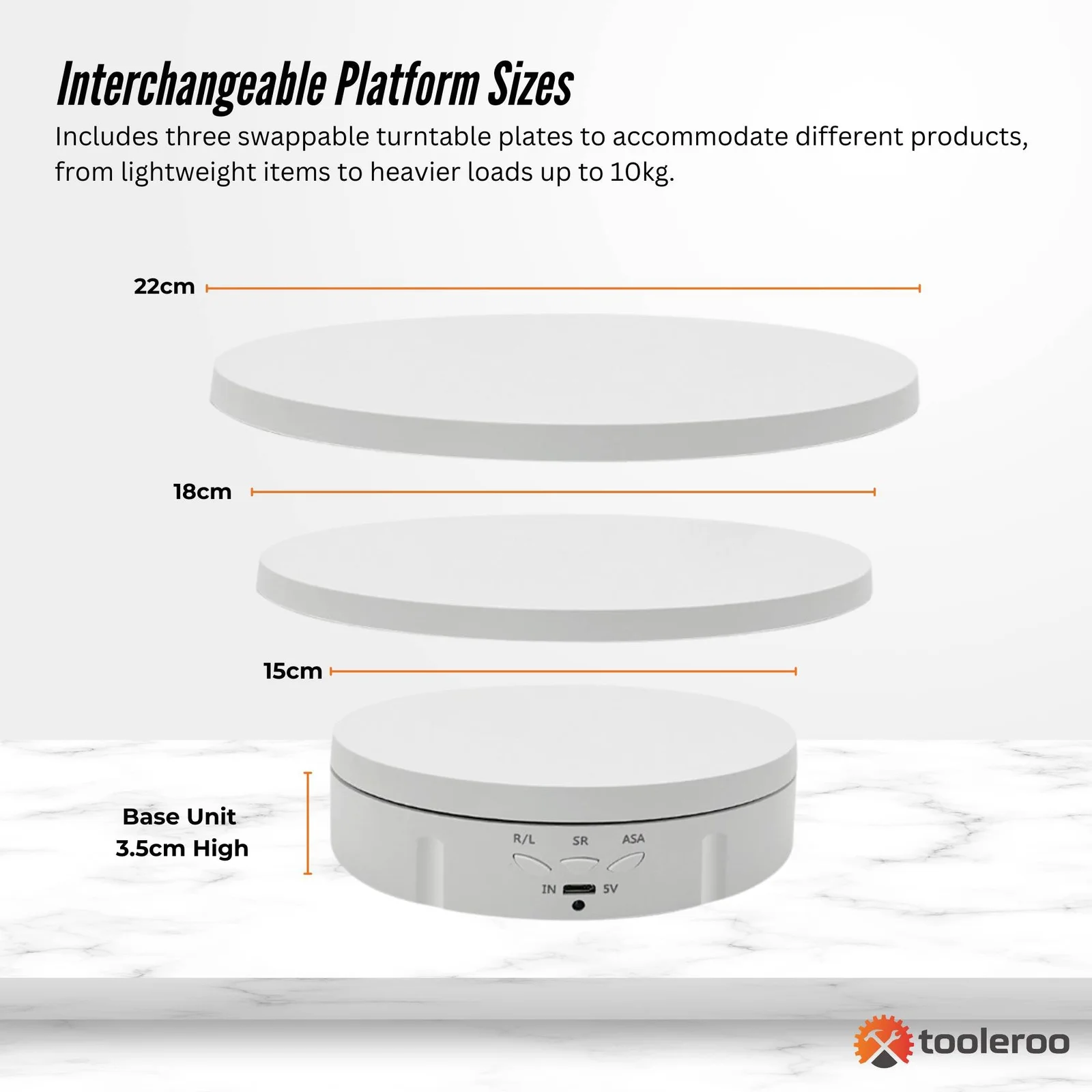 - Interchangeable Platform Sizes – Includes three swappable turntable plates (15cm, 18cm, 22cm) to accommodate different products, from lightweight items to heavier loads up to 10kg.