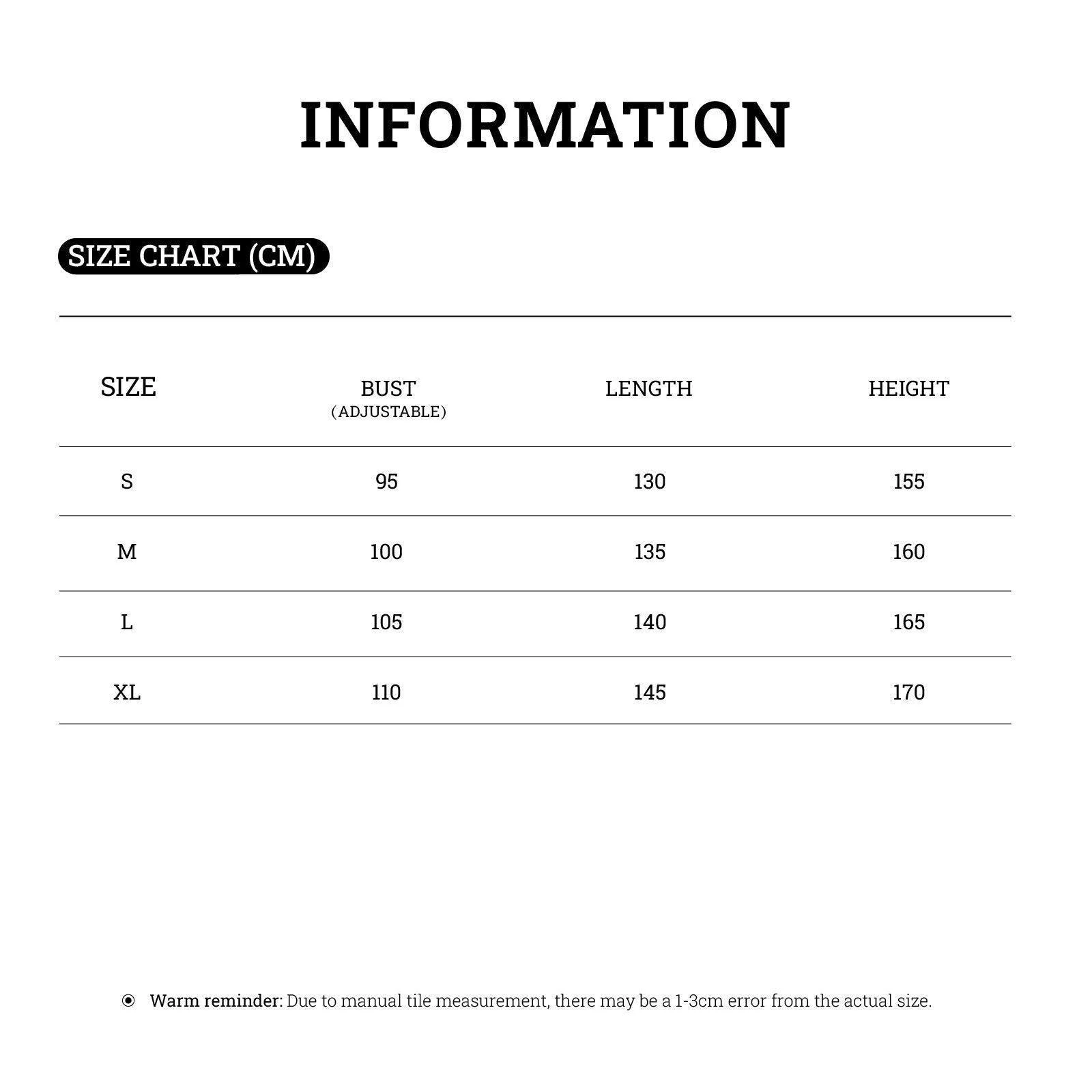 XL: Bust 110cm, Length 145cm, Height 170cm