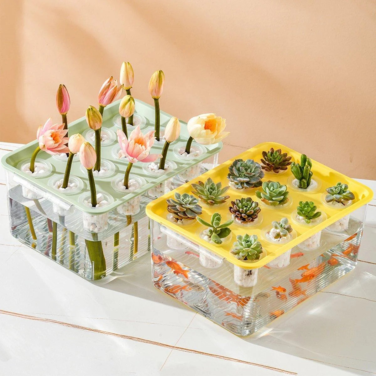 This transparent rectangular aquarium with a 12-hole lid is perfect for hydroponic gardening enthusiasts and fish lovers alike.Its dual-purpose design allows you to cultivate plants hydroponically while also housing small fish or aquatic pets below.Crafted with a clear, sturdy material, it provides a full view of both plants and aquatic life.Ideal for creating a natural and aesthetically pleasing environment in your home or office. Available in three stylish colours to suit any decor.