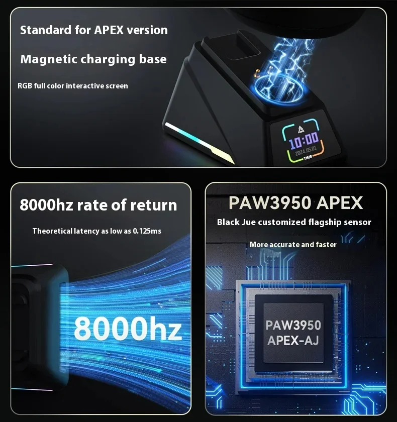 This product contains a lithium battery. Performance parameters (e.g. battery life, DPI, rate of return) may vary slightly depending on the specific version and configuration. Charging the mouse near eyes or face should be avoided. Refer to the user manual for optimal use and charging procedures. The "overclockable" DPI feature may require specific software and drivers. Small hands may feel more comfortable holding this device due to its weight and size. The charging base featuring a color screen requires periodic charging.