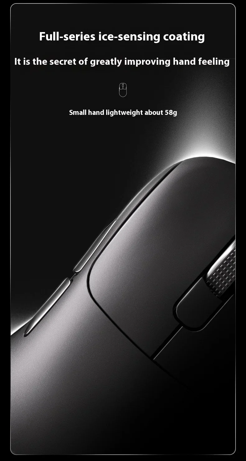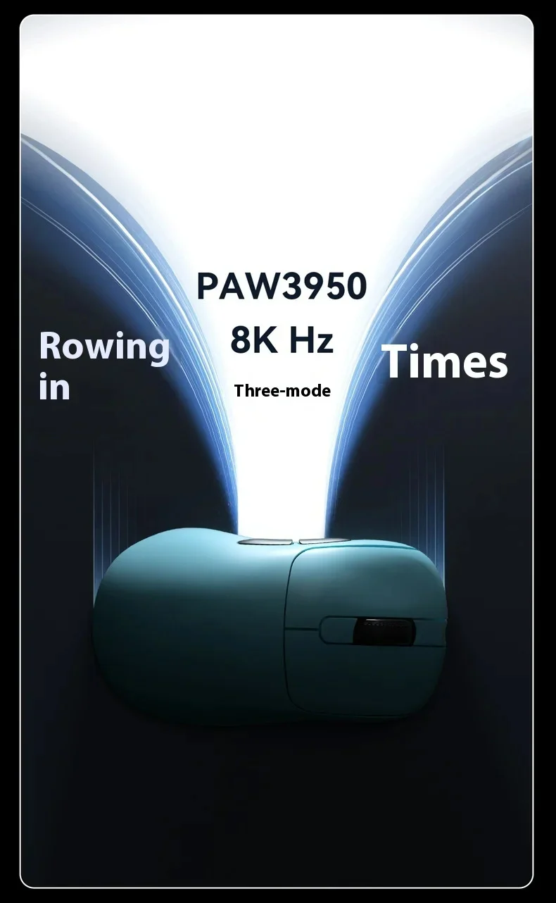 Dominate the competition with our Tri-Mode Wireless Gaming Mouse. Designed for peak performance, this mouse features a PAW3950 sensor for exceptional accuracy and responsiveness. Experience ultra-low latency with an 8000Hz wireless rate of return. It provides tri-mode connectivity, including Wireless, Bluetooth, and Wired options to cater to any gaming or work setup. A magnetic charging base offers convenient instant charging. Its ice-sensing coating provides greatly improved hand feeling and comfort. Crafted for small to medium hands with a lightweight build of around 58g, this mouse promotes agility and reduces fatigue. It features highly durable micro-motion control switches, tested for 100 million triggers, and an ultra-long-life 400mAh battery. Enjoy full control and a seamless gaming experience with this state-of-the-art gaming mouse.