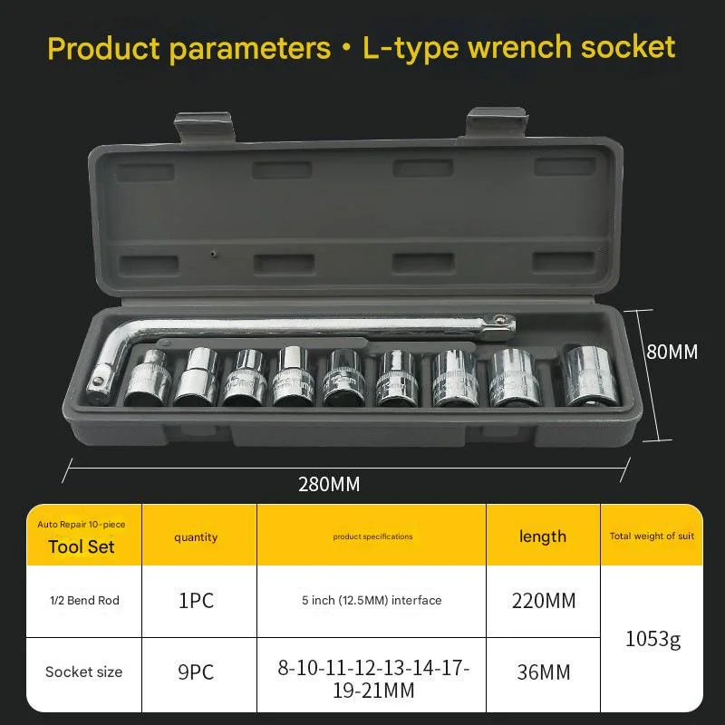 Tackle tough jobs in industrial, automotive, and household settings with this durable 10-Piece L-Shaped Socket Wrench Set. The entire set is forged from high-quality, heat-treated Chrome Vanadium steel, ensuring it is sturdy, wear-resistant, and can withstand high impact. The L-shaped wrench is designed to provide excellent leverage, making it time-saving and labor-saving for loosening and tightening stubborn nuts and bolts. The wrench features a spring-loaded detent ball to securely lock sockets in place, preventing them from slipping off during use. This comprehensive set includes 9 common metric sockets and comes in a convenient storage case, making it perfect for professional maintenance, tire repair, and industrial manufacturing.