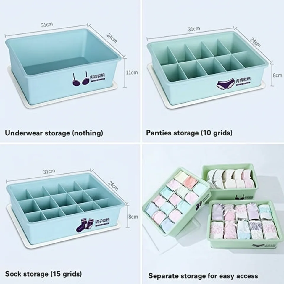 Keep your essentials perfectly organized with our stackable storage solution! This elegant mint green 3-piece set features dedicated compartments for socks, underwear, and bras, each with clear labels for easy identification. The fitted lids protect your intimates from dust while maintaining privacy.