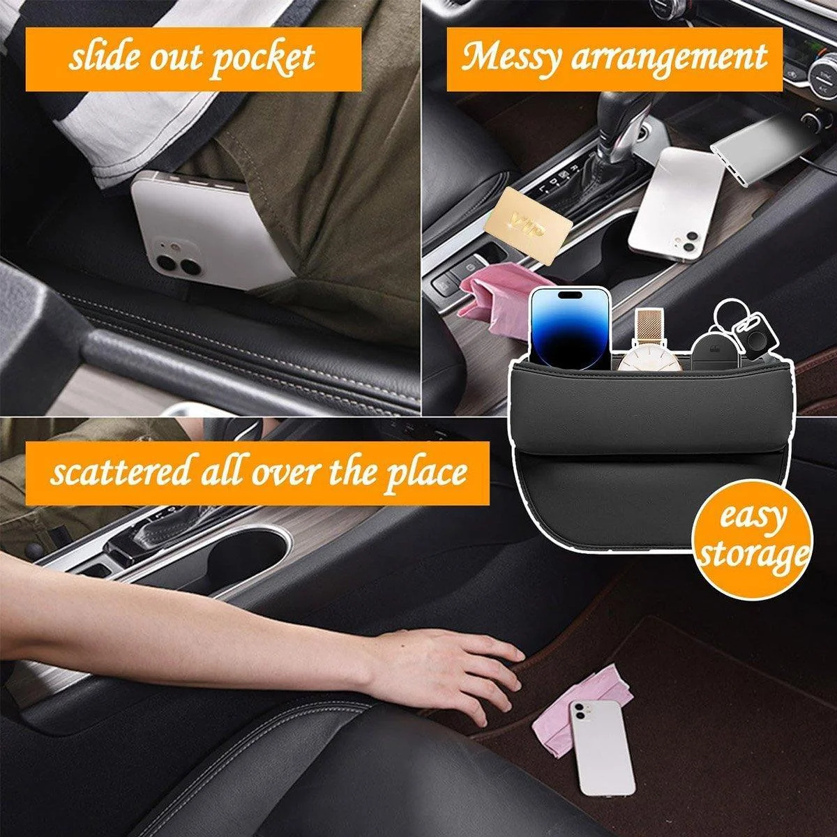 Designed to fit seamlessly between your front seat and centre console, it maximises unused space and keeps essentials like phones, keys, and small items within easy reach.