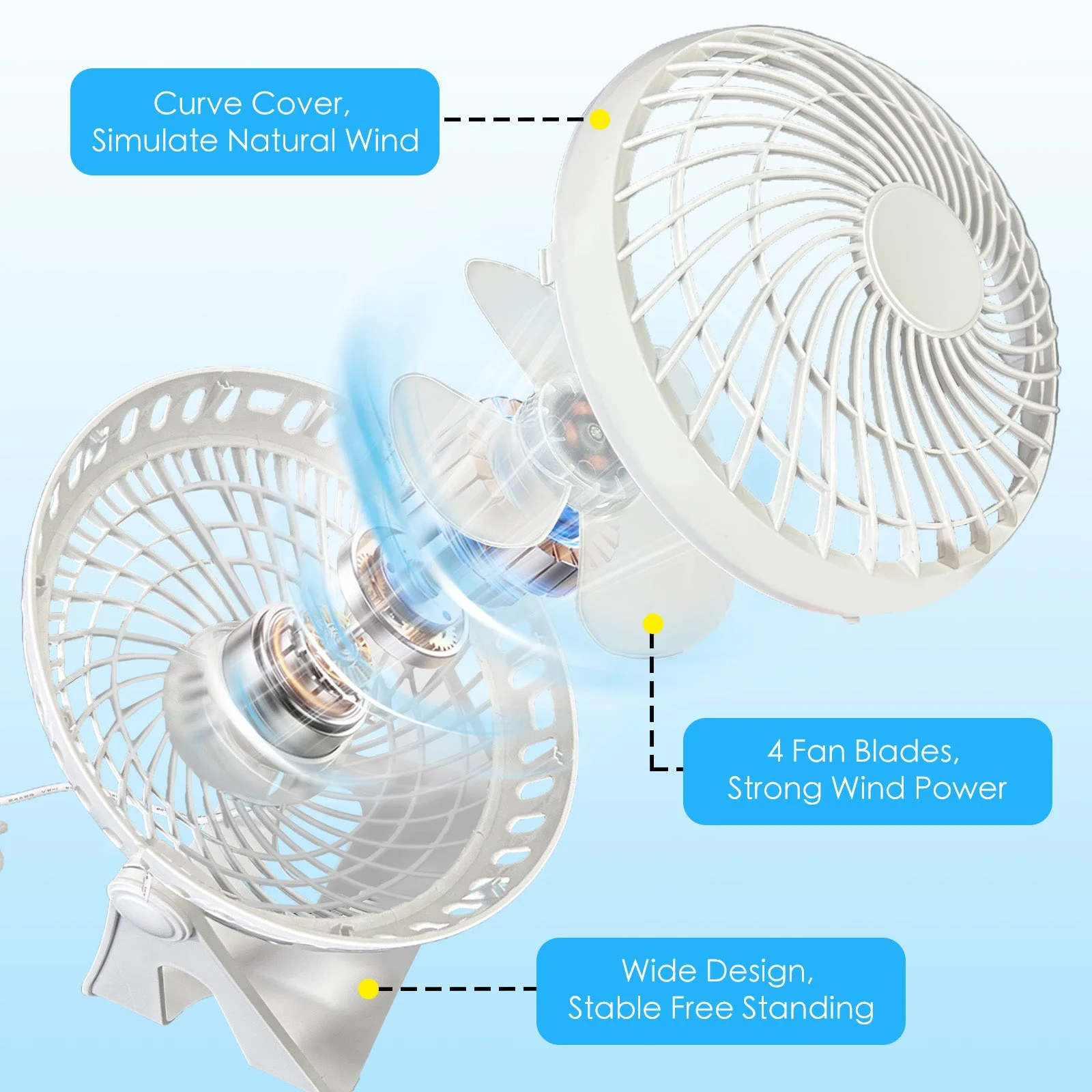 Strong Wind Power: 4 fan blades with curve cover simulate natural wind circulation.