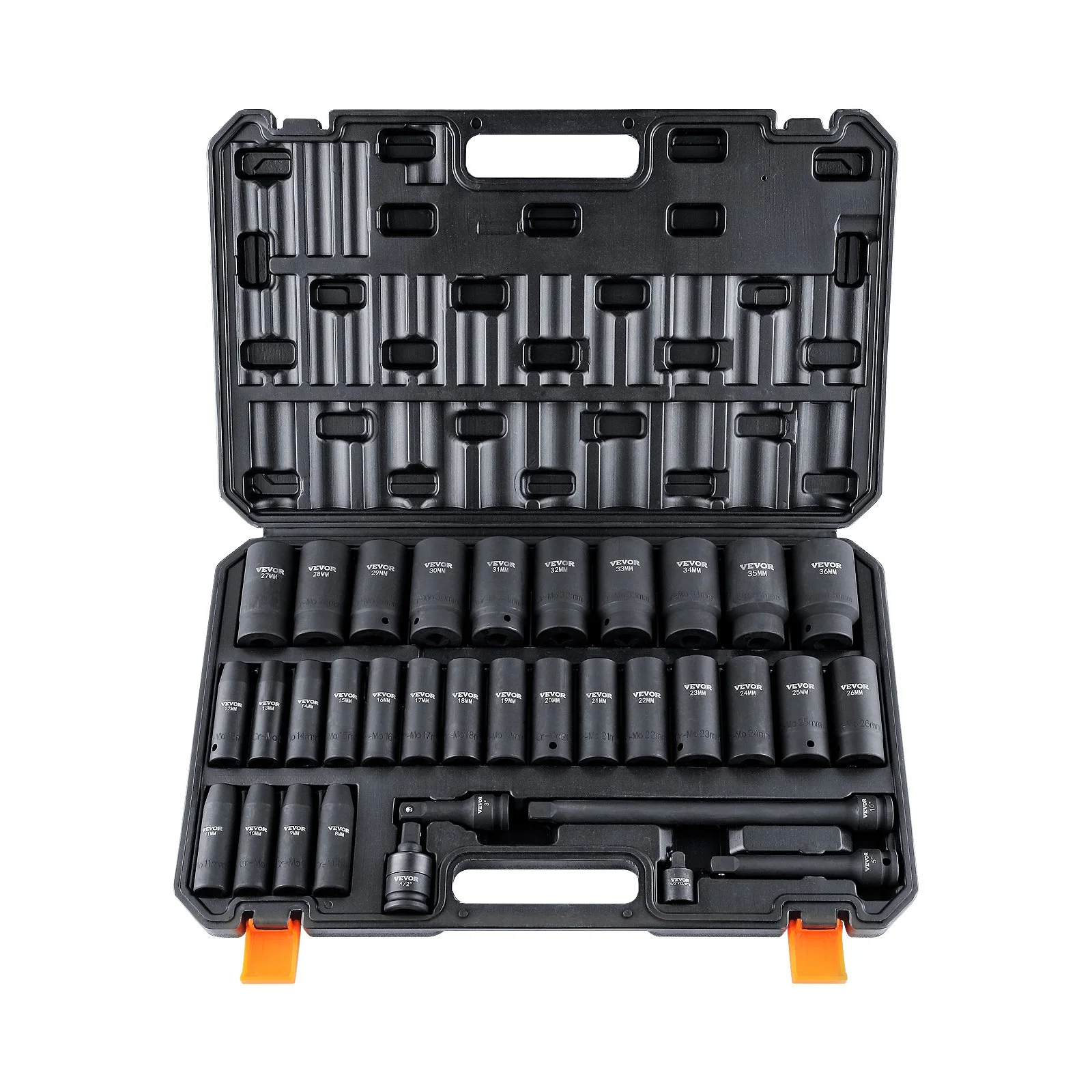 This comprehensive set includes an array of components, such as deep sockets 8mm, 9mm, 10mm, 11mm, 12mm, 13mm, 14mm, 15mm, 16mm, 17mm, 18mm, 19mm, 20mm, 21mm, 22mm, 23mm, 24mm, 25mm, 26mm, 27mm, 28mm, 29mm, 30mm, 31mm, 32mm, 33mm, 34mm, 35mm, 36mm. Other components include extension bars in lengths of 3",5",10", 1/2" impact universal adapter, 1/2"F x 3/8"M adapter.