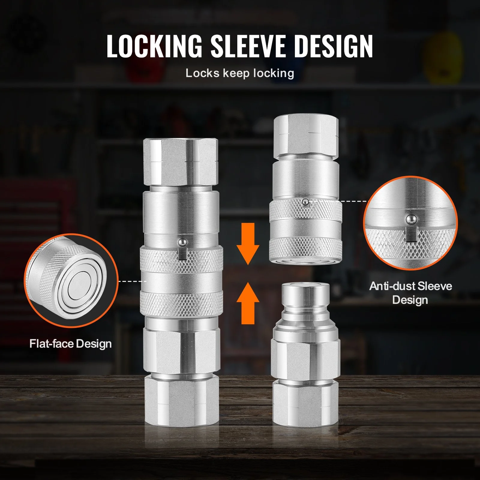 The flat face hydraulic couplers employs a sleeve locking design, allowing for easy connection with just a simple push. The flat-faced design of the coupler facilitates easy cleaning and prevents dust from entering the hydraulic system during connection and disconnection.
