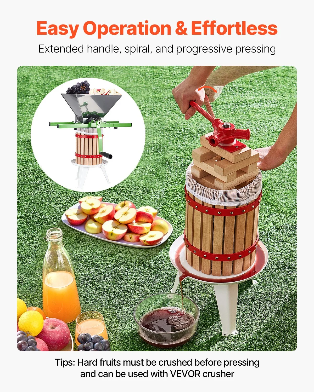 The 6L/1.6-gallon large-capacity design is ideal for family gatherings, parties, wineries, and farms to conveniently produce abundant juice. The hard fruits must be crushed before pressing, and can be used with VEVOR crusher
