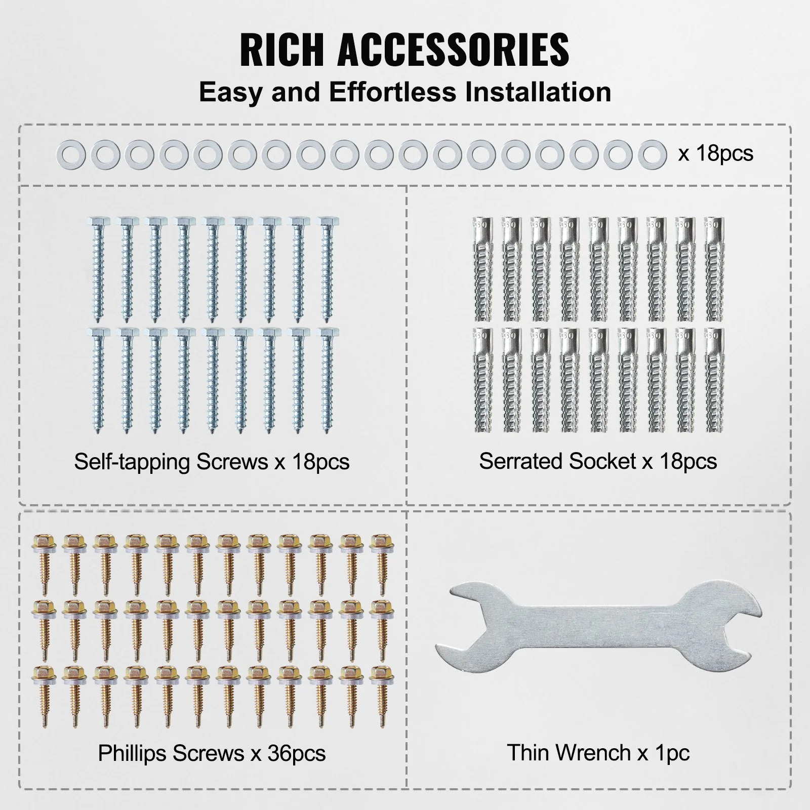 The kit includes a complete set of accessories: Dovetail Screws M525 (36pcs), Thin Wrench M8 Open-End 14 (1pc), Serrated Sleeves M8 (18pcs), Self-Tapping Screws M860 (18pcs). Installation is straightforward and hassle-free.