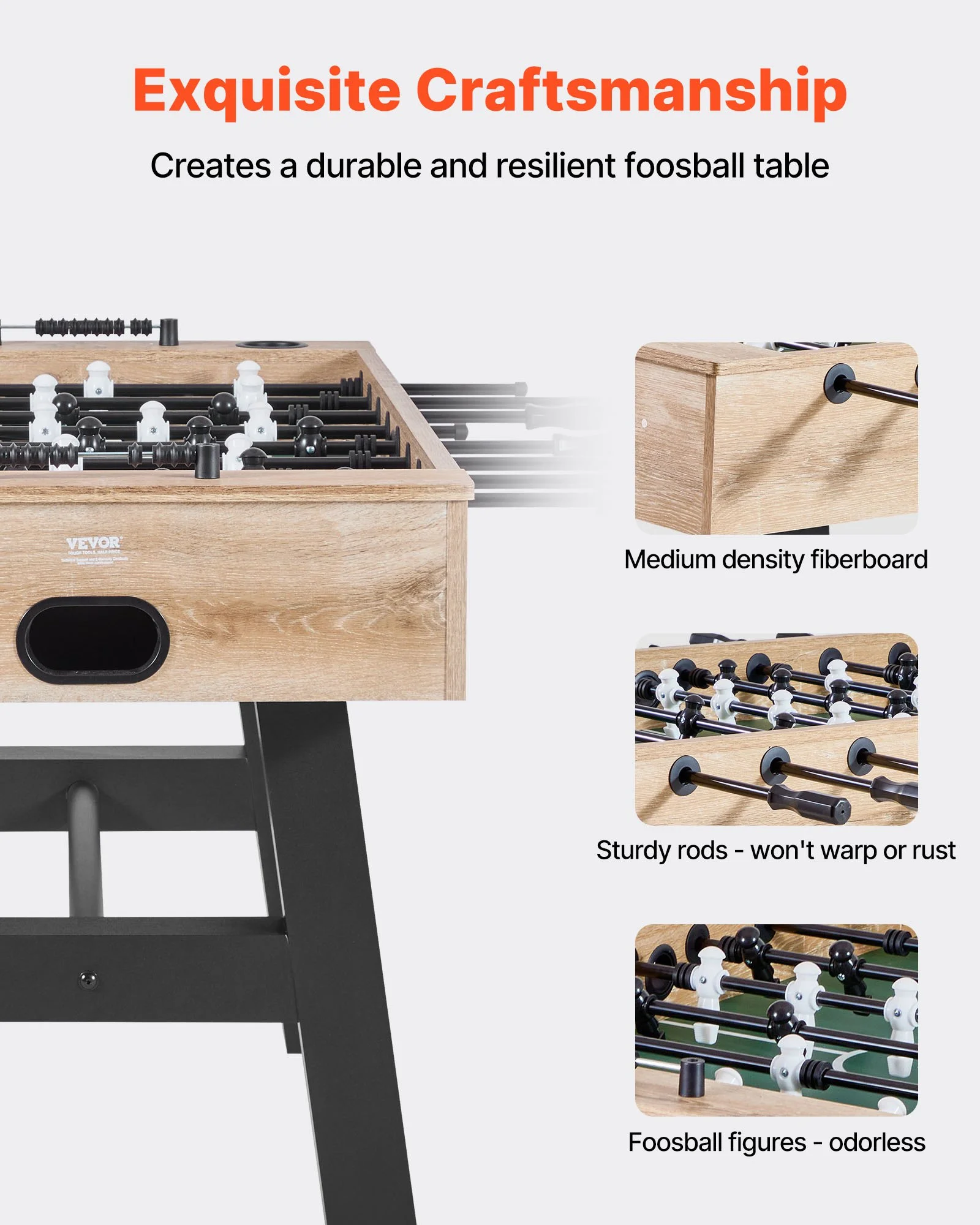 The 55-inch foosball table is made of medium density fiberboard, durable and mold-resistant. It features 26 players and 4 footballs. The rods are straight and smooth, ensuring powerful strikes without bending or rusting