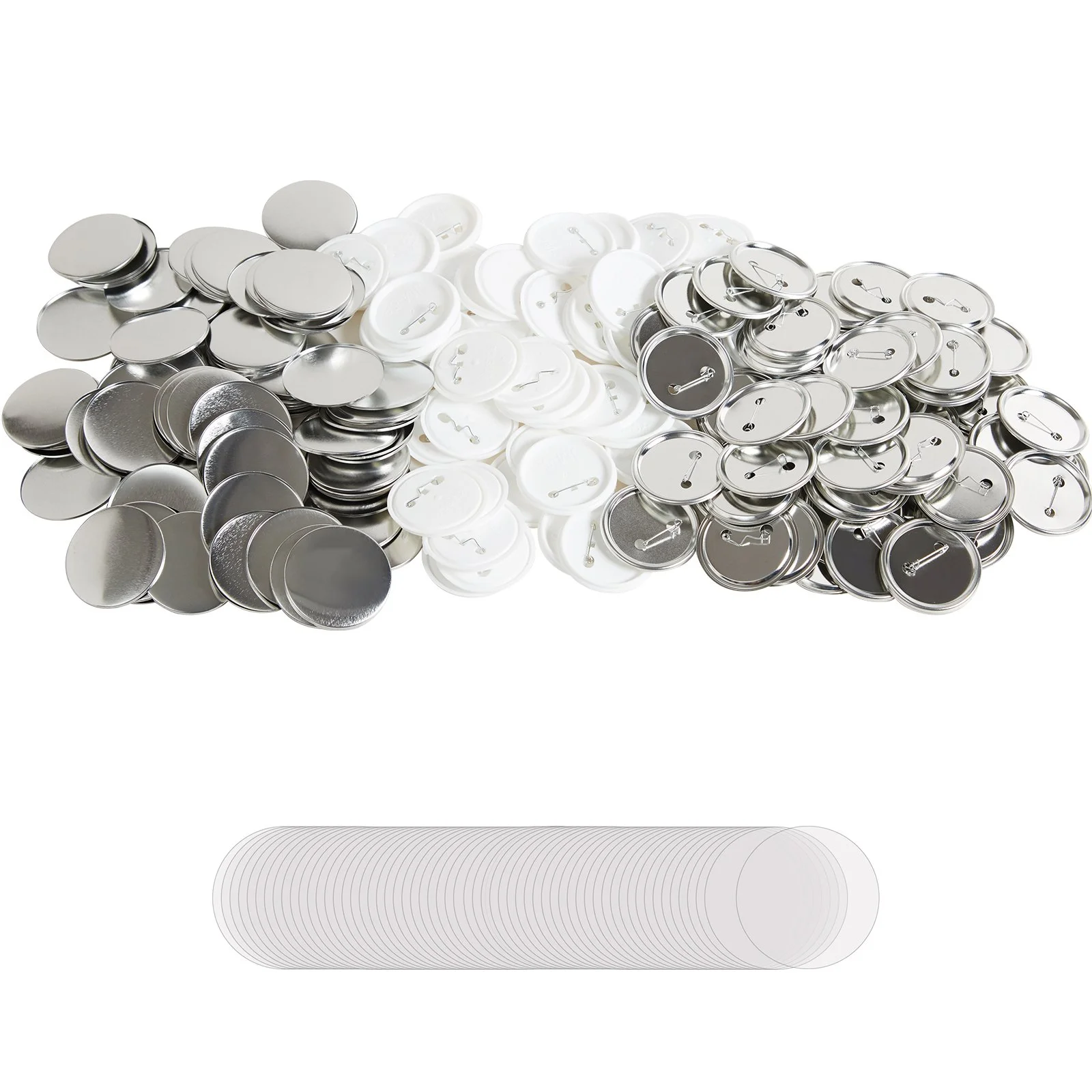 You will get 500 sets of pinback button parts to make 500 pretty button badges, including 500 pcs transparent films, 500 pcs metal covers, 250 pcs metal bottom parts, 250 pcs plastic bottom parts, and 2 washes. The number of all parts is the same. In addition, different metal and plastic bottom parts can satisfy your different needs.