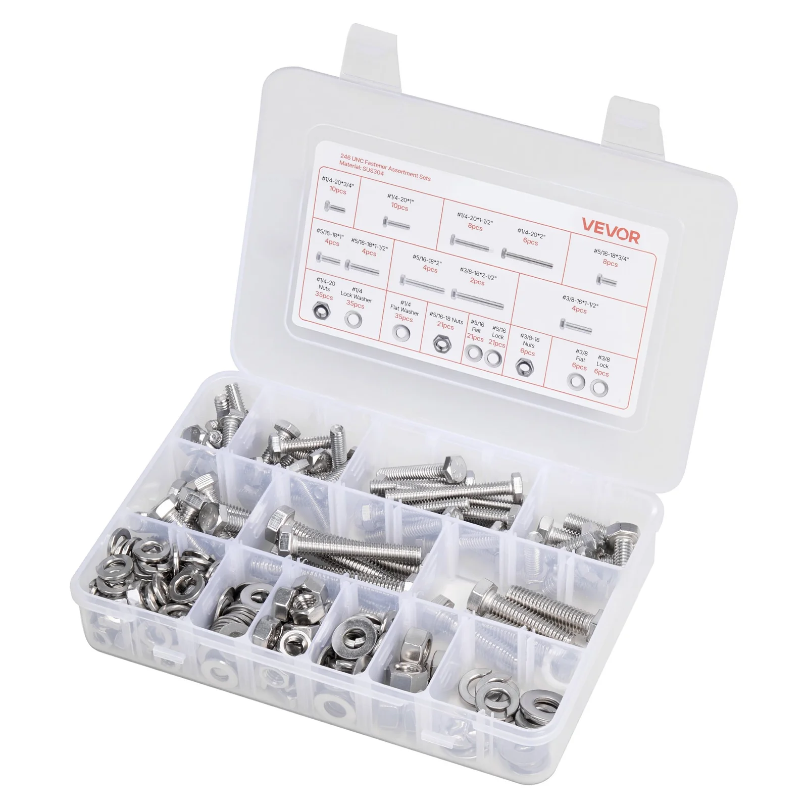 This practical bolts, nuts, and washers set includes 246 pieces of imperial bolts, nuts, and washers, covering #1/4-20, #5/16-18, #3/8-16 (including flat washers and spring washers in #1/4, #5/16, #3/8 sizes) in various lengths. Ideal for general repairs and replacements