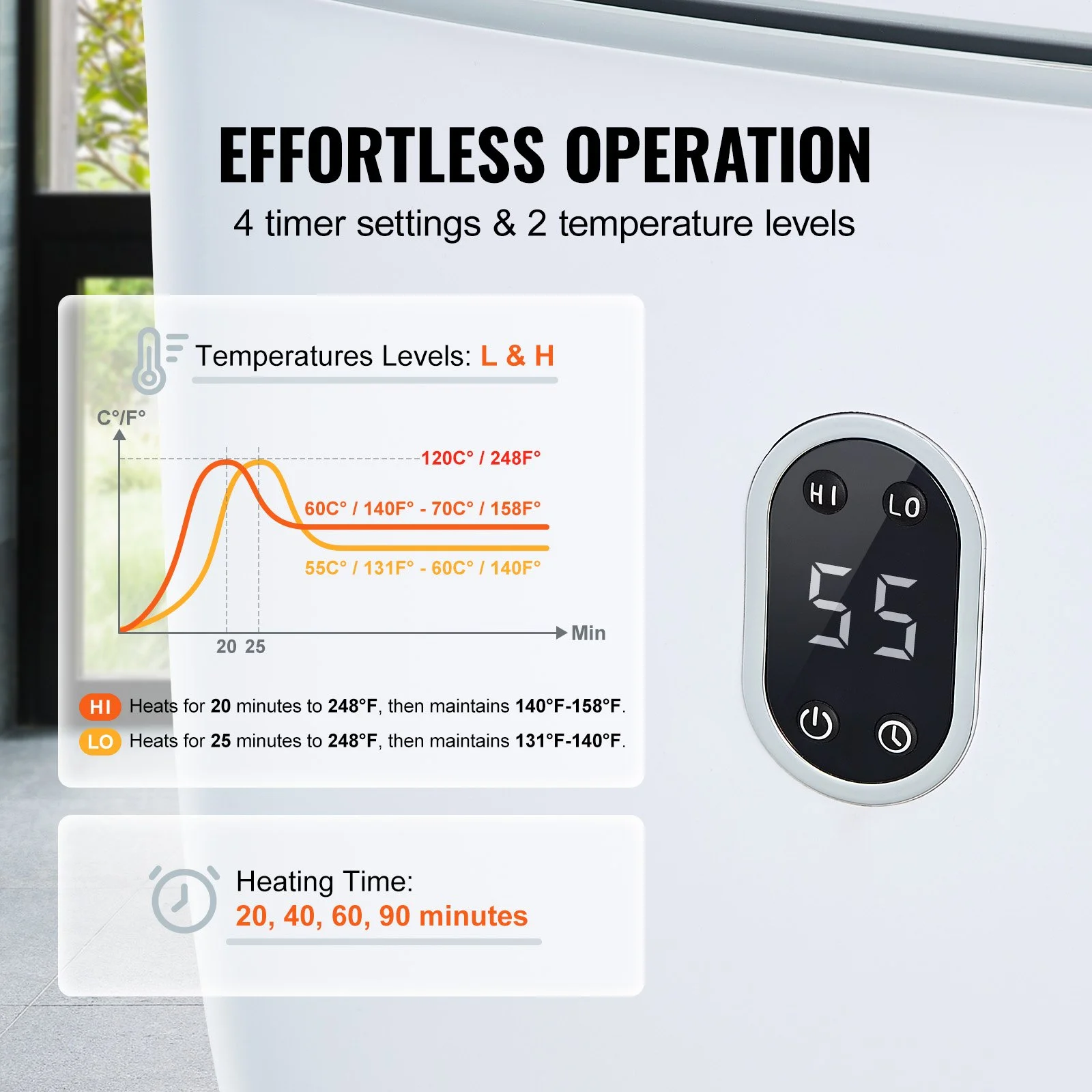The towel warmer bucket features user-friendly operation design. You can freely choose from 4 timer settings (20, 40, 60, 90 minutes), High and Low temperature modes offer flexibility according to your needs.