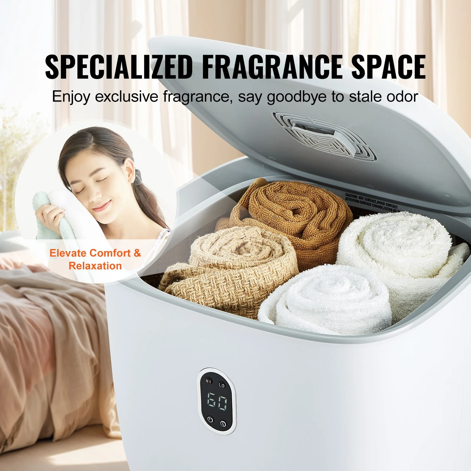 The smart towel warmer bucket is equipped with an aroma placement area, you can insert various fragrance discs or essential oils soaked pad to give your towels and blankets a unique scent. Enjoy a delightful aroma every time you use your towels and blankets.