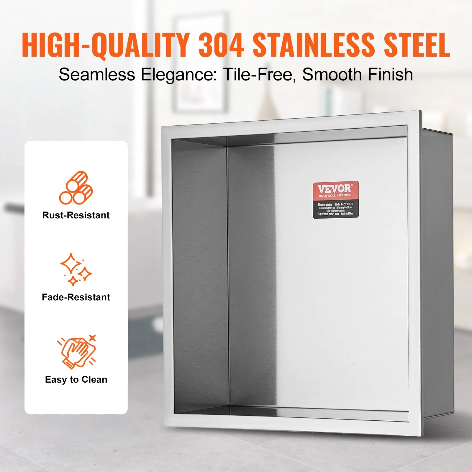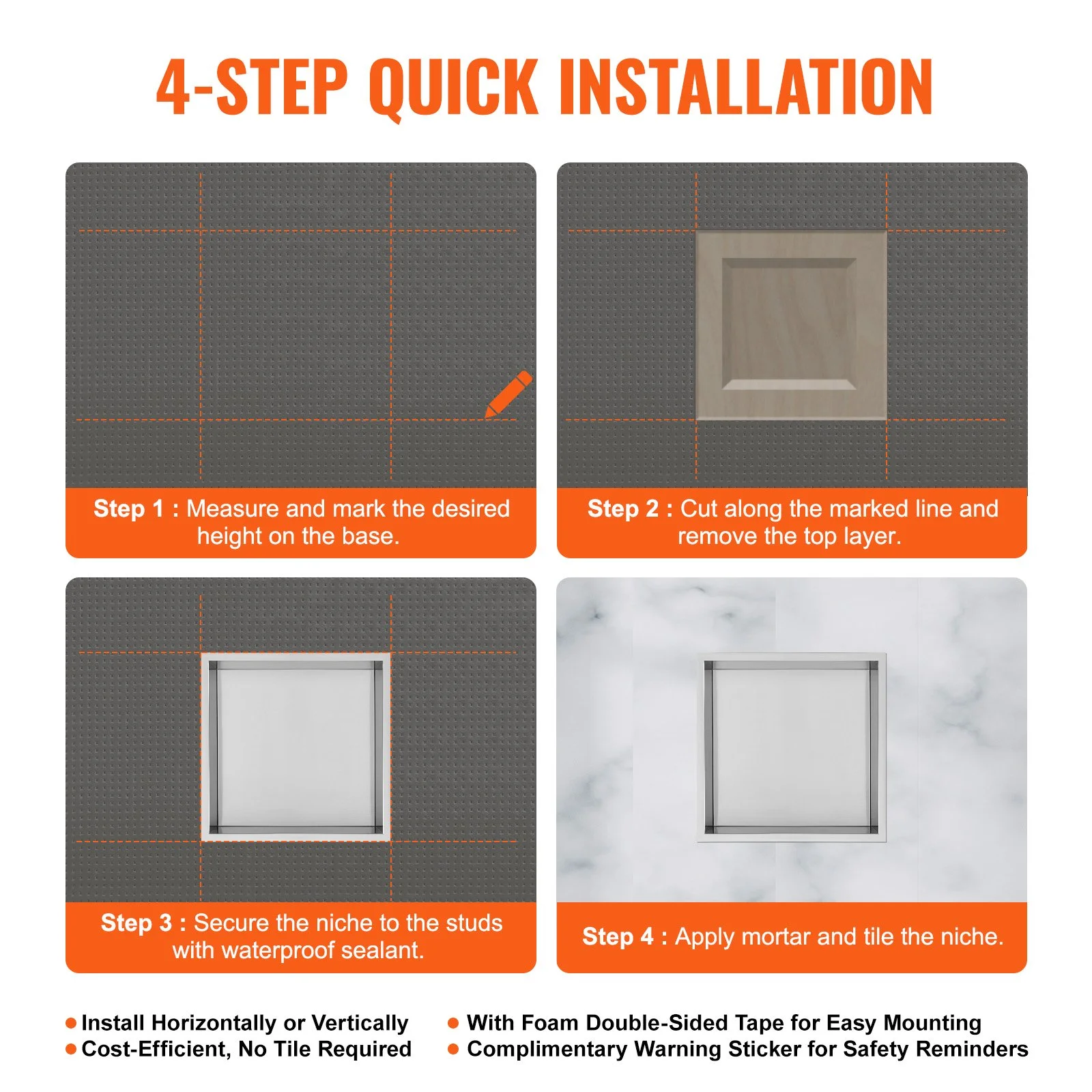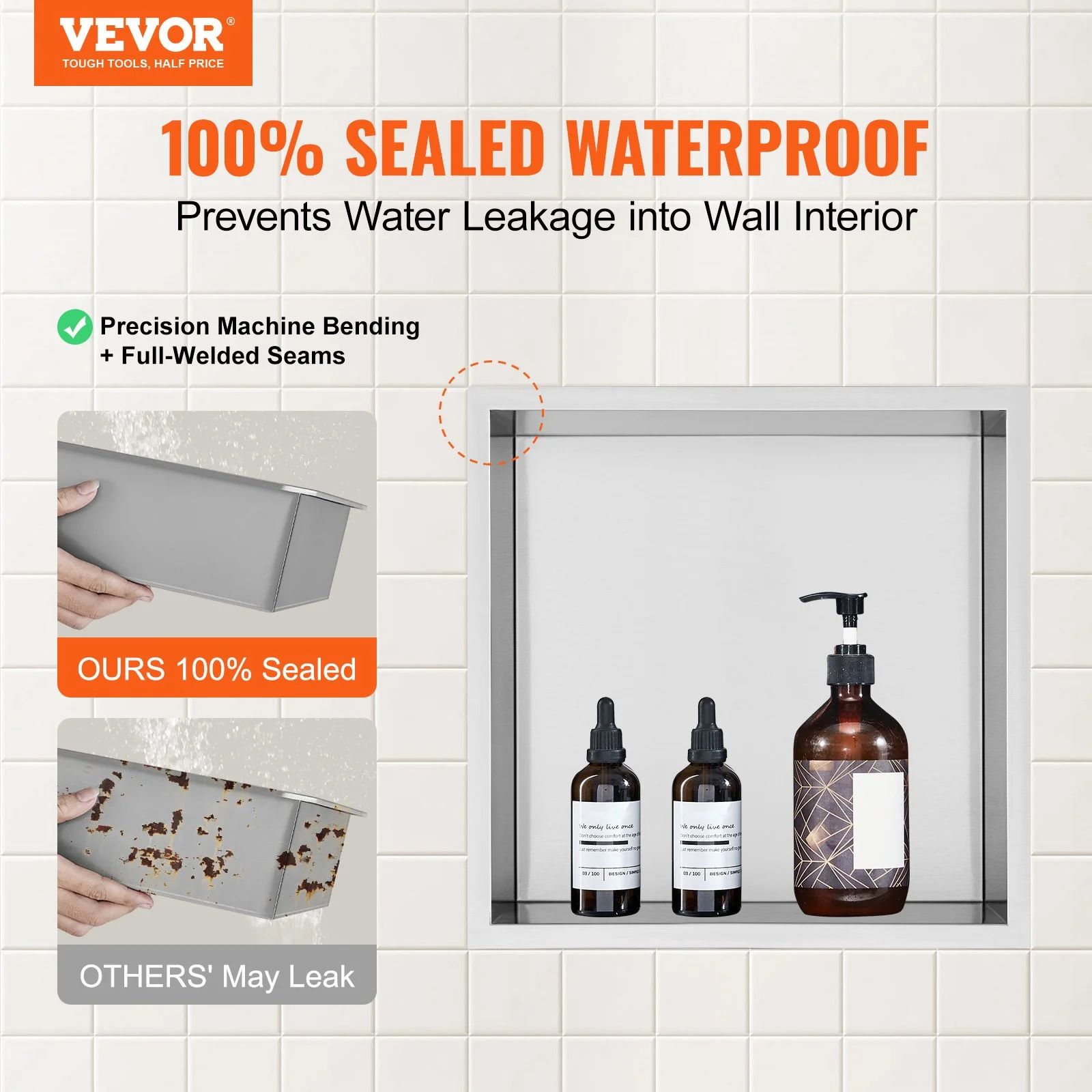 VEVOR shower niche utilizes X-line precision machine bending and full welding sealing, resulting in a seamless surface with a 100% seal waterproofing. This not only protects the walls from moisture and humidity, extending their lifespan but also effectively prevents moisture from penetrating into the wall, keeping the interior dry and hygienic.